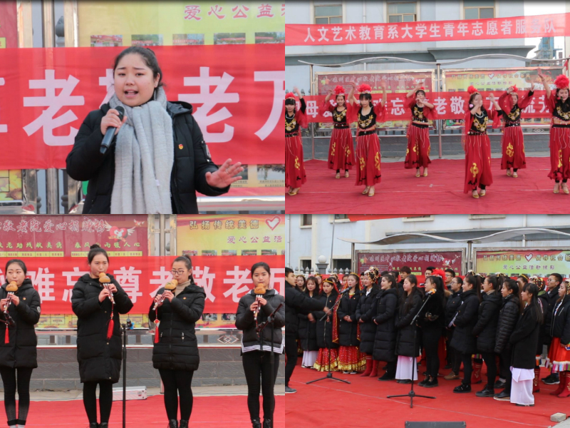 為了充分發(fā)揮青年學(xué)生在傳播文明,弘揚(yáng)新風(fēng)中的先鋒模范作用,發(fā)揚(yáng)我系師生尊老敬老的優(yōu)良品德。12月23日,人文藝術(shù)教育系團(tuán)總支組織帶領(lǐng)50多名青年志愿者在指導(dǎo)教師唐鑫基帶領(lǐng)下赴涼州區(qū)中心敬老院慰問(wèn)演出。