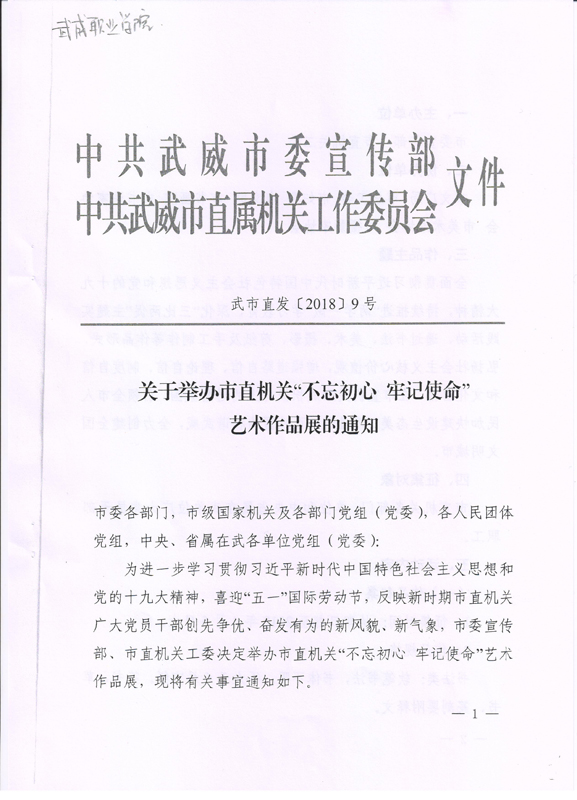 關于組織參加武威市直屬機關“不忘初心 牢記使命”藝術作品展的通知