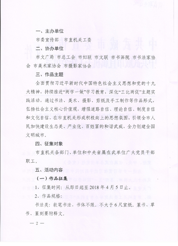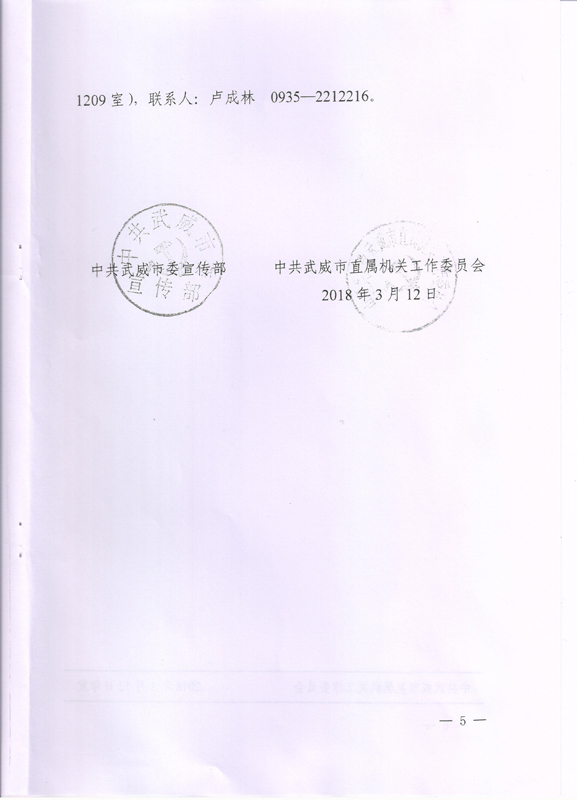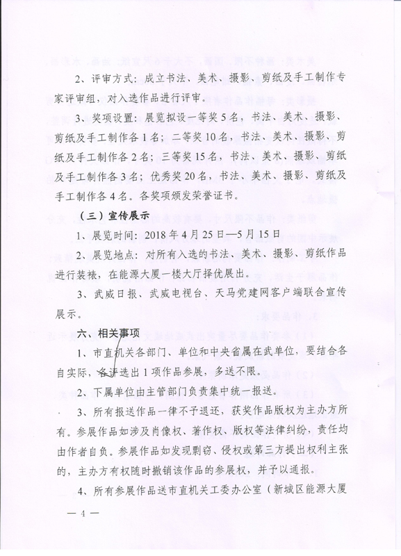 現(xiàn)將中共武威市委宣傳部、中共武威市直屬機關工作委員會《關于舉辦市直機關“不忘初心? 牢記使命”藝術作品展的通知》(武市直發(fā)〔2018〕9號)轉(zhuǎn)發(fā)你們,請各部門、單位根據(jù)要求認真組織,積極參與。將參賽作品于4月2日前報宣傳統(tǒng)戰(zhàn)部辦公室,宣傳統(tǒng)戰(zhàn)部對報送作品匯總后統(tǒng)一報送市直屬機關工委。