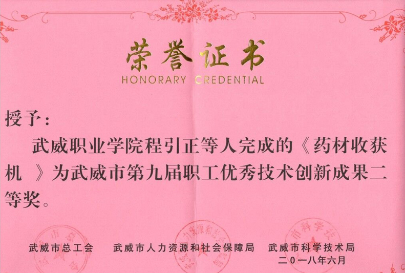 近日,武威市總工會、武威市人力資源和社會保障局、武威市科學(xué)技術(shù)局在全市企事業(yè)單位和廣大職工中廣泛開展了征集評選職工優(yōu)秀技術(shù)創(chuàng)新成果活動。經(jīng)過逐級推薦、專家評審、網(wǎng)絡(luò)公示等程序,我系教師程引正等完成的《藥材收獲機》喜獲武威市第九屆職工優(yōu)秀技術(shù)創(chuàng)新成果二等獎。