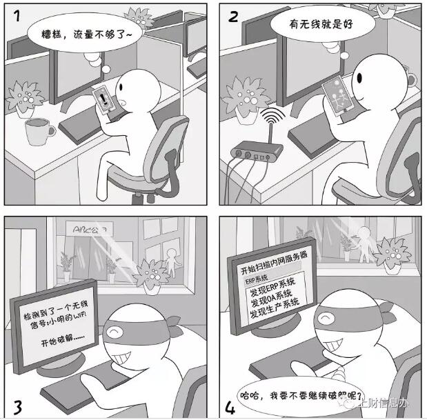 無線路由器有較多的安全隱患,比如之前的wep認證能很輕易破解。個人架設(shè)無線路由器,如果配置不當,家用最多導致蹭網(wǎng)或個人資料泄露,但在單位使用可能會導致內(nèi)網(wǎng)被入侵,單位機密、客戶資料泄密,后果不堪設(shè)想。