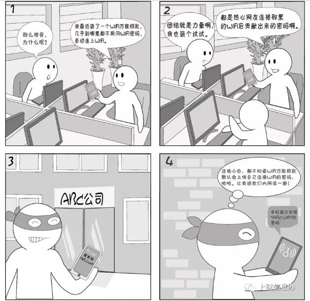 手機上的WIFI萬能鑰匙類的APP在安裝后默認設(shè)置會自動上傳你所連接的WIFI的密碼。這些密碼一般不會明文給出,只會在連接WIFI時自動輸入,但曾爆出漏洞用一個APP能讀出檢測到WIFI的密碼,這樣就可以用筆記本接入WIFI使用更強大的攻擊工具了。