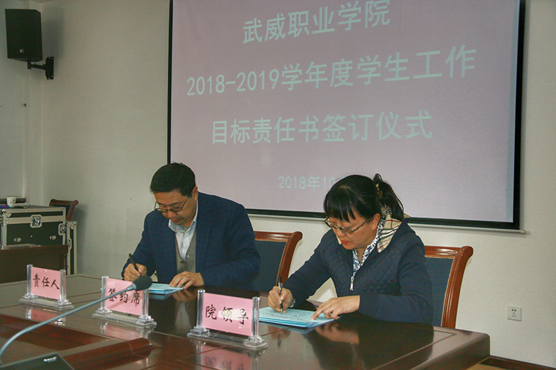 責(zé)任書簽訂儀式上,田迎春代表學(xué)院與各系黨總支書記或負(fù)責(zé)人簽訂了《武威職業(yè)學(xué)院2018-2019學(xué)年度學(xué)生工作目標(biāo)責(zé)任書》。她充分肯定了各系2017-2018學(xué)年的學(xué)生工作,并就我院學(xué)生工作提出了具體要求,一是學(xué)生工作要緊緊圍繞“立德樹人”的根本任務(wù),樹立全院全員育人思想,各系要強(qiáng)化學(xué)生工作管理責(zé)任,增強(qiáng)工作主動性和責(zé)任性,使學(xué)生管理的各項(xiàng)工作更細(xì)、更實(shí);二是各系要在學(xué)生思想政治教育和日常管理工作中堅(jiān)持誰主管誰負(fù)責(zé)的原則,力求做到“工作規(guī)范化、管理精細(xì)化、服務(wù)人性化”;三是各系及學(xué)工部門在思想上要與學(xué)院保持高度一致,在工作落實(shí)上與學(xué)院保持相向而行,切實(shí)將目標(biāo)責(zé)任書的承諾轉(zhuǎn)化為抓工作、謀發(fā)展、促改革的具體行動;四是要在就業(yè)創(chuàng)業(yè)上下功夫,促進(jìn)畢業(yè)生就業(yè)率有所提高、就業(yè)質(zhì)量不斷上升;五是各系要繼續(xù)發(fā)揚(yáng)勇于創(chuàng)新、開拓進(jìn)取的精神,以更飽滿的熱情、更昂揚(yáng)的斗志、更務(wù)實(shí)的作風(fēng)推進(jìn)我院學(xué)生管理工作的科學(xué)發(fā)展。