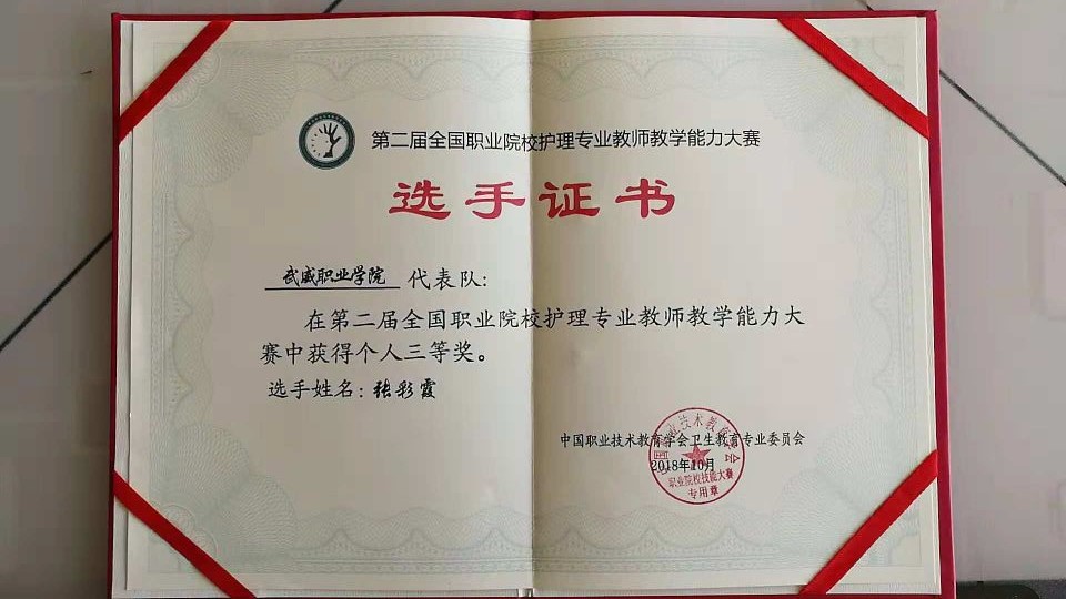 競賽共分為理論考核、說課程和臨床護(hù)理技能操作三個(gè)部分。其中,臨床護(hù)理技能操作部又分為三項(xiàng),心肺復(fù)蘇術(shù)和靜脈輸液操作技術(shù)為必選項(xiàng)目,置胃管技術(shù)和氣管切開護(hù)理技術(shù)為抽選項(xiàng)目。經(jīng)過三天緊張激烈的比拼,通過了全部考核內(nèi)容的綜合評定,最終張彩霞老師獲得了三等獎(jiǎng)。