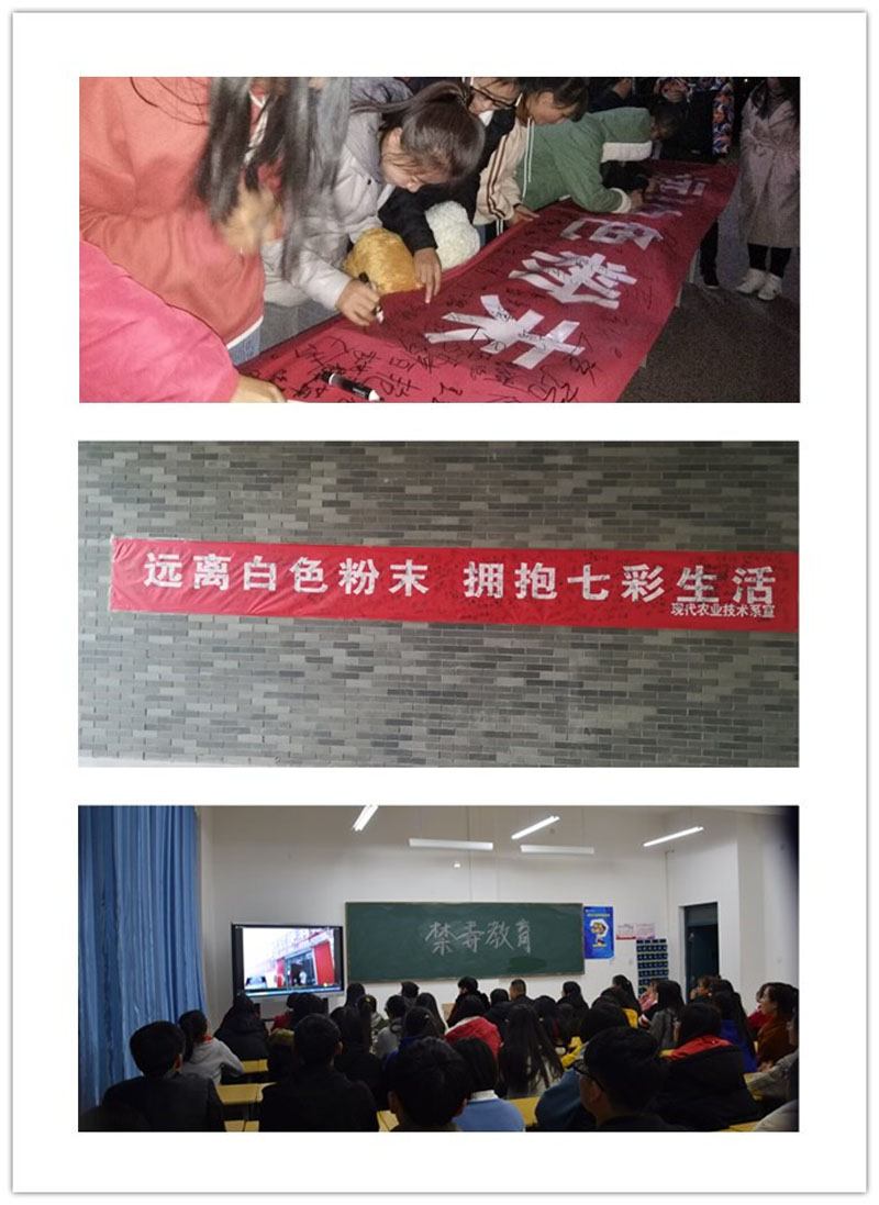 現(xiàn)代農(nóng)業(yè)技術(shù)系結(jié)合自身實(shí)際和條件,重點(diǎn)開(kāi)展了以下活動(dòng)。一是通過(guò)在行樹(shù)樓張貼“遠(yuǎn)離白色粉末擁抱七彩生活”禁毒橫幅,號(hào)召全系師生創(chuàng)建和諧、文明、無(wú)毒的校園環(huán)境;二是各班開(kāi)展了禁毒宣傳主題班會(huì),宣傳毒品危害,普及防毒知識(shí),警示大家珍愛(ài)生命,遠(yuǎn)離毒品;三是組織學(xué)生參加學(xué)院禁毒征文大賽,用語(yǔ)言表達(dá)禁毒的決心;四是團(tuán)學(xué)會(huì)組織各班同學(xué)網(wǎng)上參觀“中國(guó)禁毒數(shù)字展覽館”,觀看禁毒題材的優(yōu)秀微電影《一路有你》、《少年的秘密》、《蛻變》、《愛(ài)心帶你回家》,讓在場(chǎng)同學(xué)深刻感受到毒品的危害,堅(jiān)定了同學(xué)們禁毒防毒的信心。