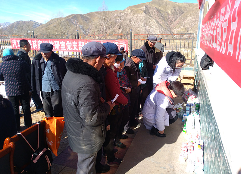 到達(dá)目的地后,黨員們不顧辛勞,分成兩組,一組由護(hù)理系黨總支書記張建輝帶領(lǐng)前往臥病在床的扶貧對象家里,親切詢問病情及家里近況,送上常備藥品。另一組在當(dāng)?shù)卮宀窟M(jìn)行義診活動,醫(yī)護(hù)人員仔細(xì)給村民們進(jìn)行體檢,耐心解答、細(xì)心診治;對前來問診的村民認(rèn)真進(jìn)行血壓、血糖、丙肝等項目的檢測、免費發(fā)放藥品并對糖尿病、高血壓等慢性病的飲食、活動和用藥進(jìn)行指導(dǎo),普及衛(wèi)生常識和健康知識。醫(yī)護(hù)人員的精心服務(wù)讓村民們倍感欣慰,受到了他們的熱烈歡迎和一致稱贊。