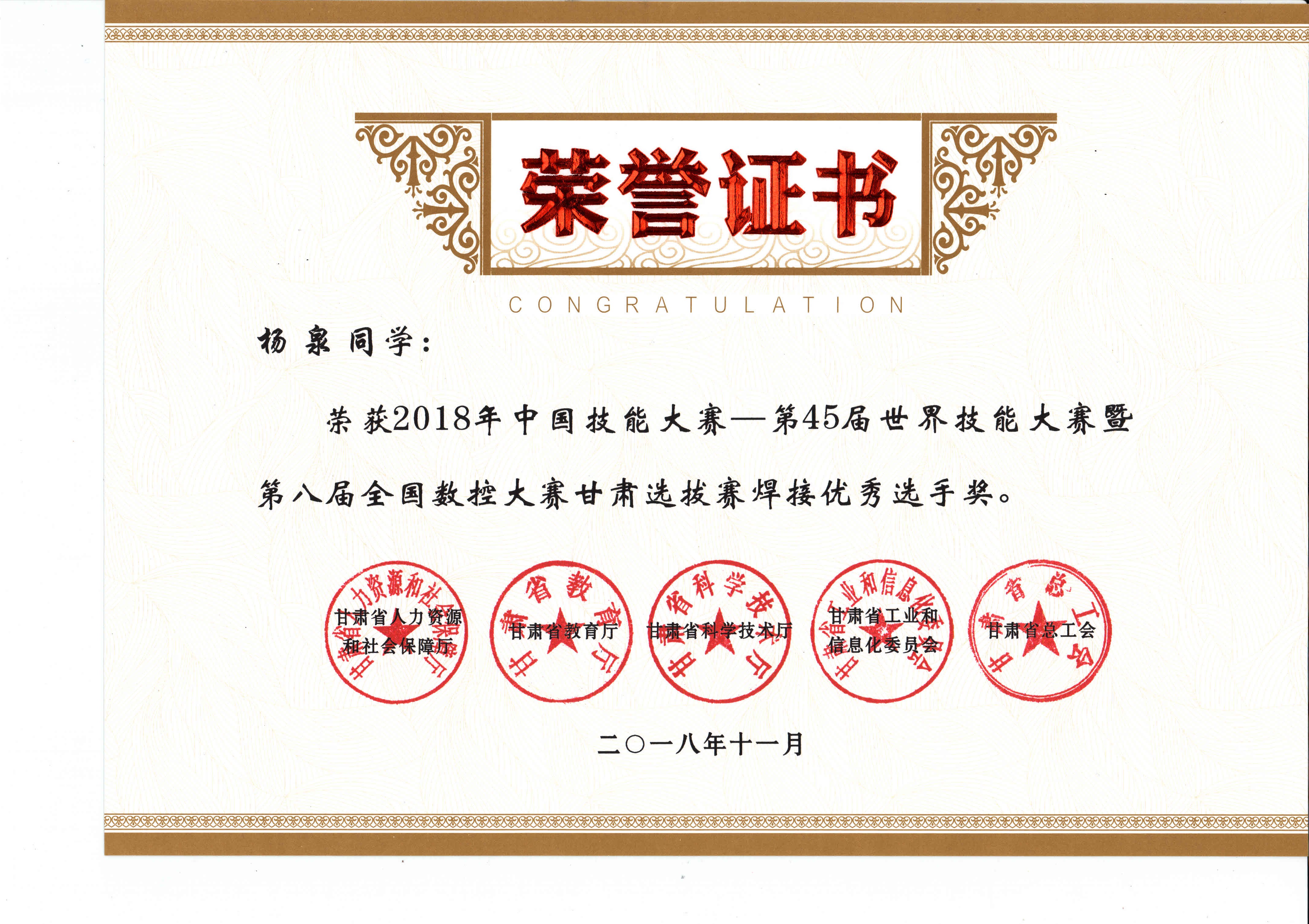 2018年中國技能大賽--第45屆世界技能大賽暨第八屆全國數(shù)控大賽甘肅選拔賽(焊接項(xiàng)目)獲獎(jiǎng)證書