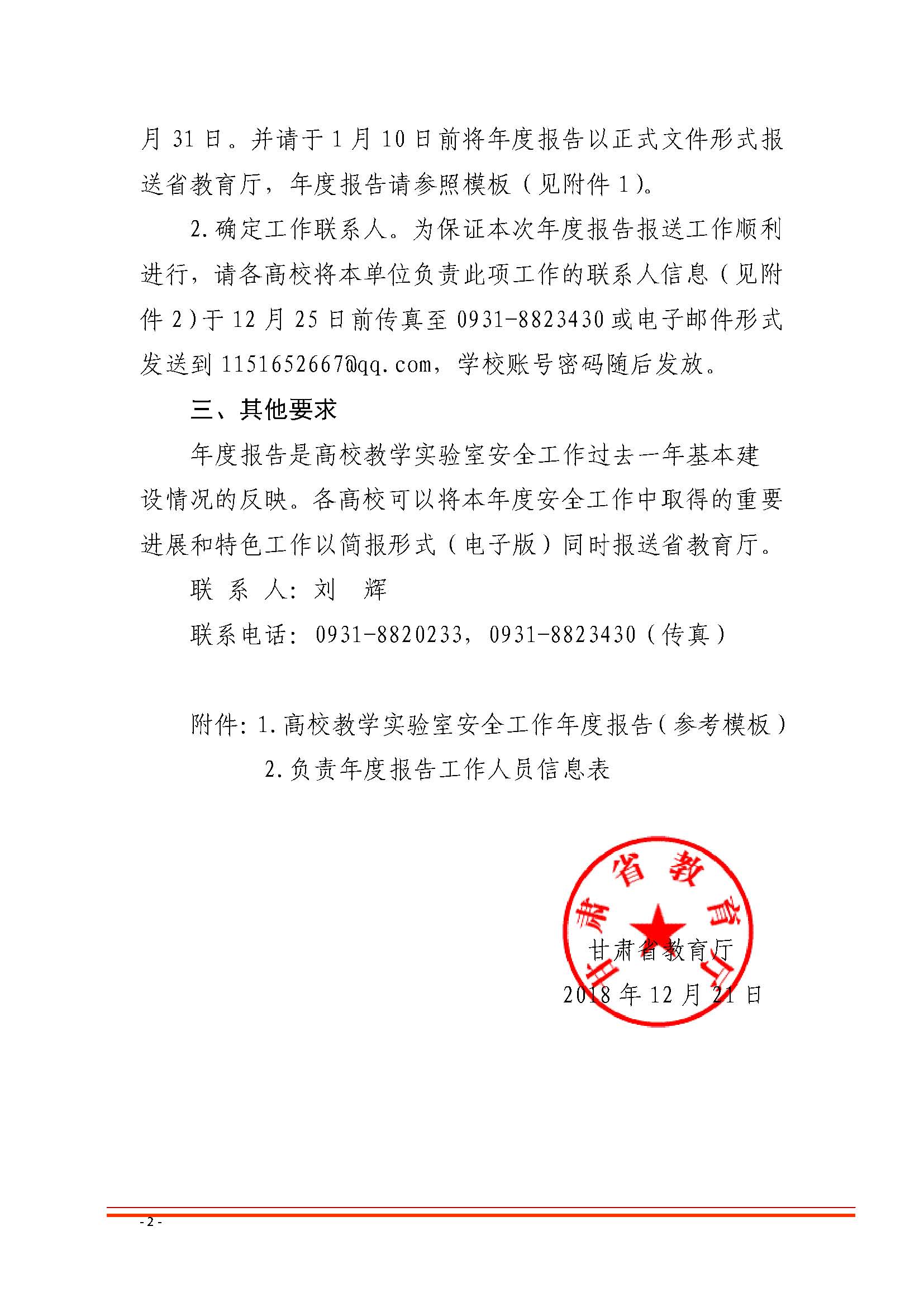 甘肅省教育廳關(guān)于做好2018年度高校教學(xué)實(shí)驗(yàn)室安全工作年度報(bào)告的通知