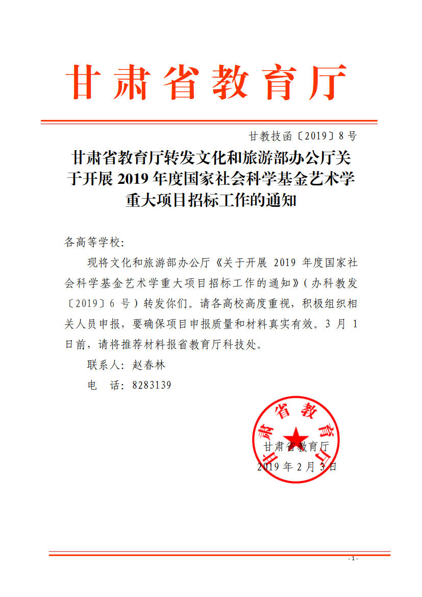甘肅省教育廳轉發(fā)文化和旅游部辦公廳關于開展2019年度國家社會科學基金藝術學重大項目招標工作的通知