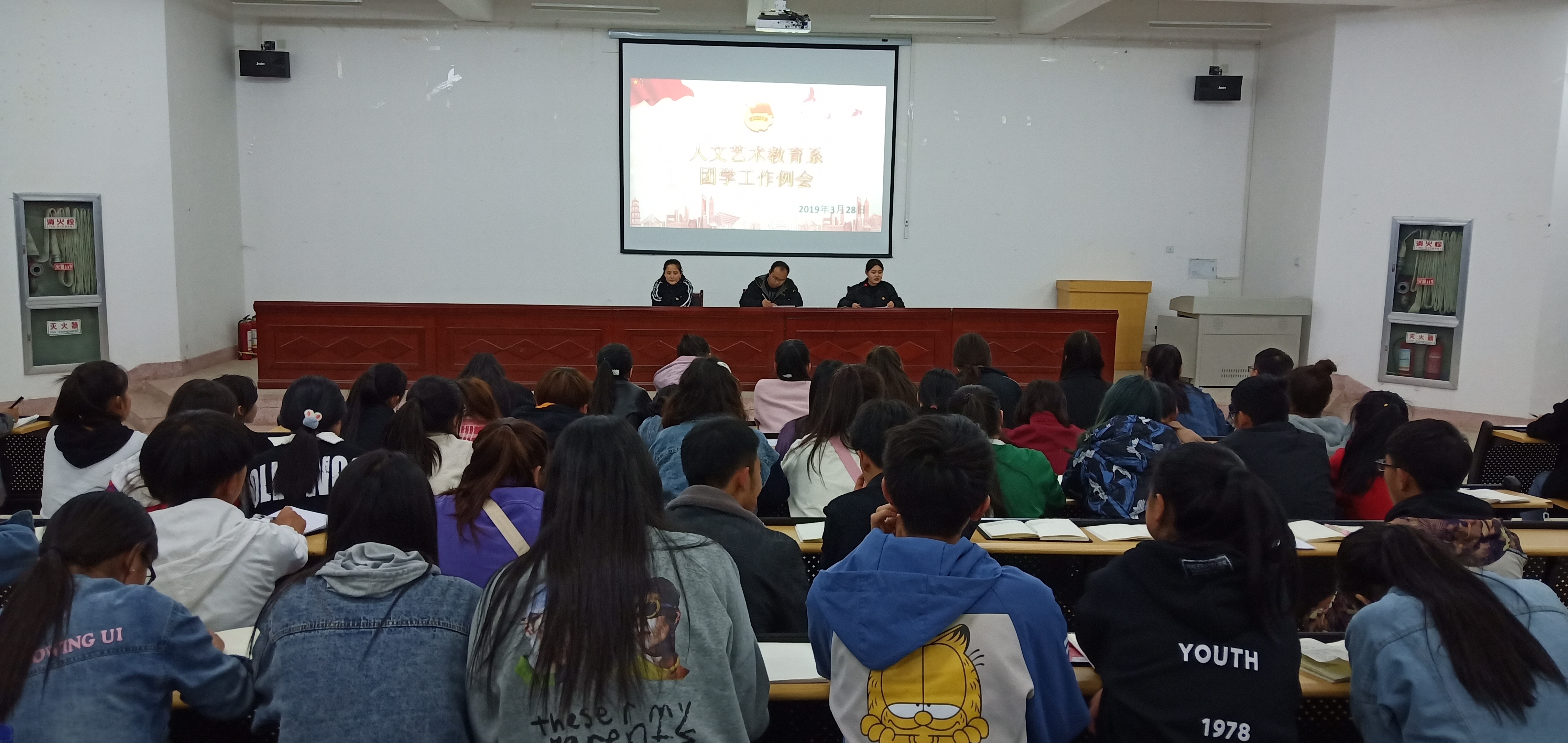 ? ? ? ?3月28日晚,人文藝術(shù)教育系在勵(lì)勤樓階梯教室召開(kāi)了三月份工作例會(huì),人文藝術(shù)教育系分團(tuán)委書記唐鑫基老師、分團(tuán)委全體學(xué)生干部,干事、17、18級(jí)各班班委共一百余人參加會(huì)議。會(huì)議安排部署了本學(xué)期分團(tuán)委共青團(tuán)常規(guī)工作和重點(diǎn)工作,討論通過(guò)了《人文藝術(shù)教育系2019年基層共青團(tuán)考核細(xì)則》。