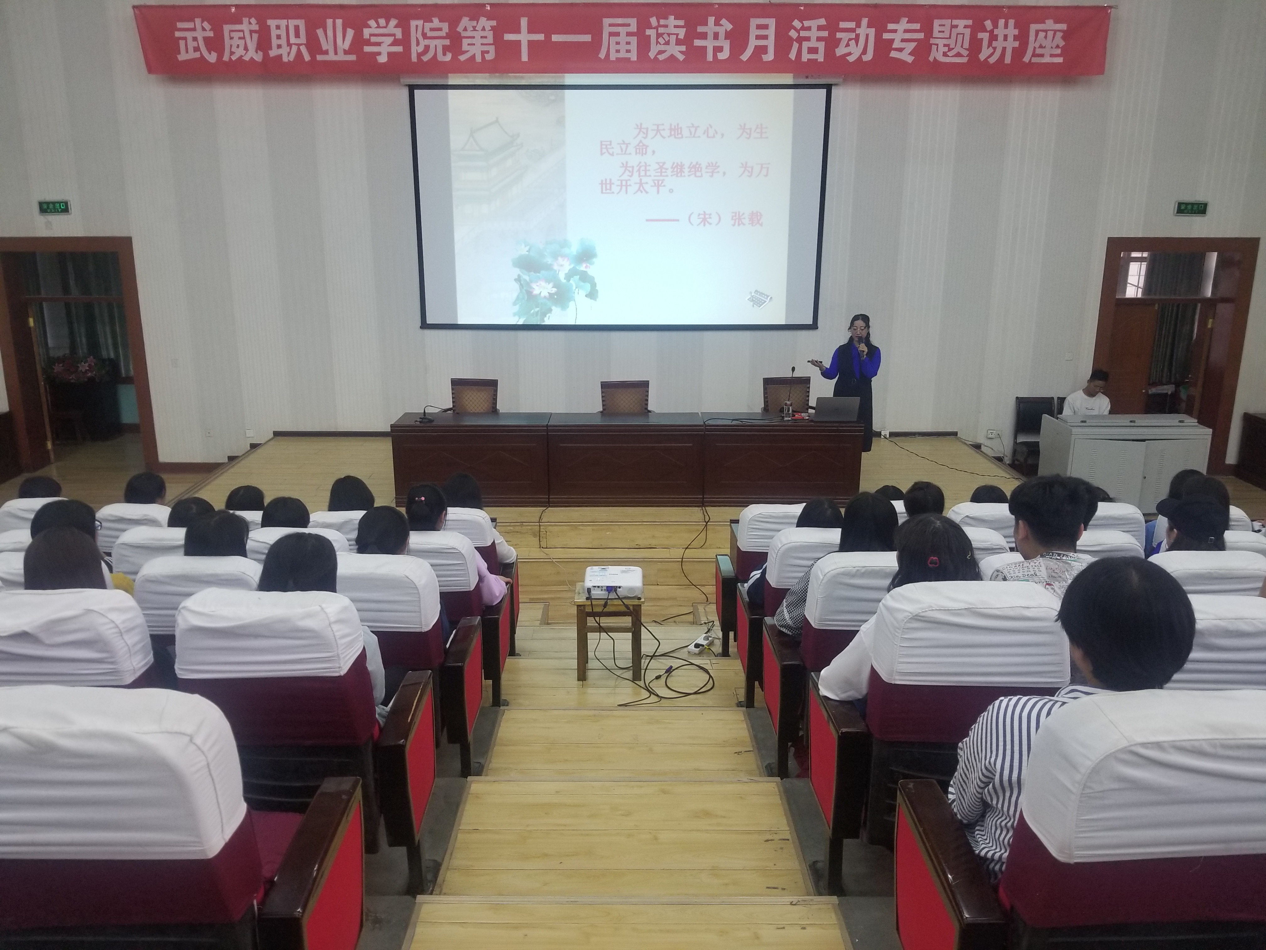 武威職業(yè)學(xué)院第十一屆讀書月活動專題講座在正德廳舉行。4月24日學(xué)院中文專業(yè)教授趙穎老師應(yīng)邀進行了《走進國學(xué)》的專題講座,近300名師生參加了此次講座。