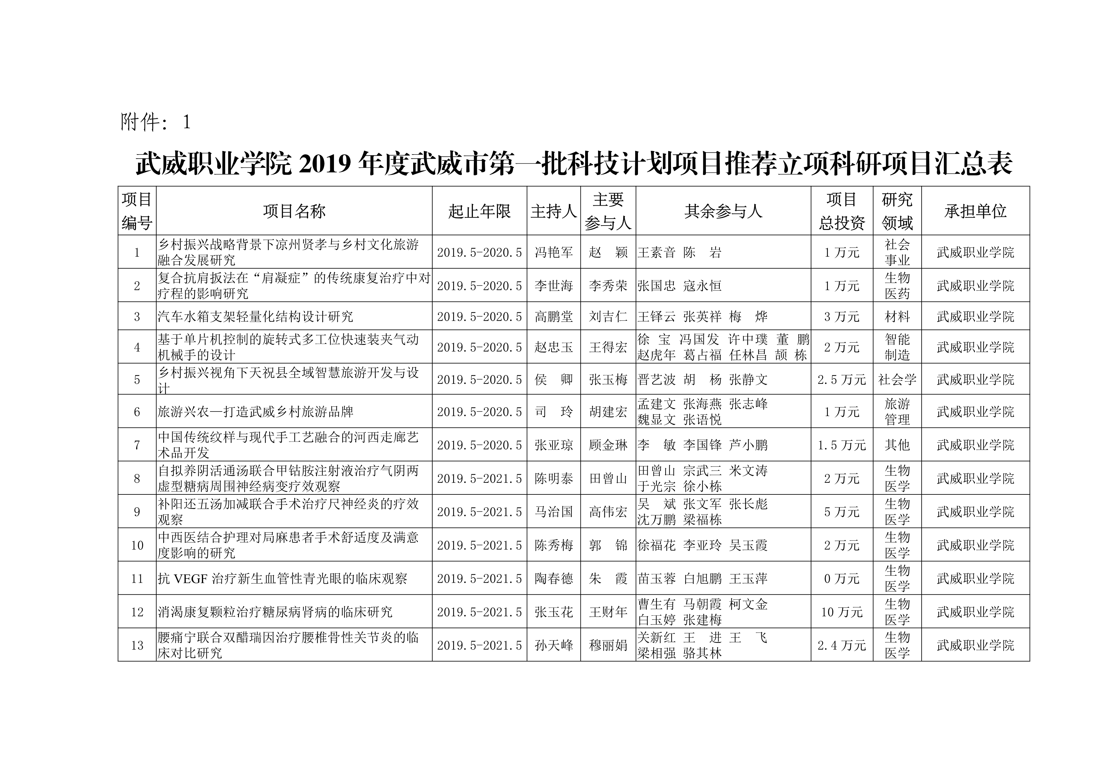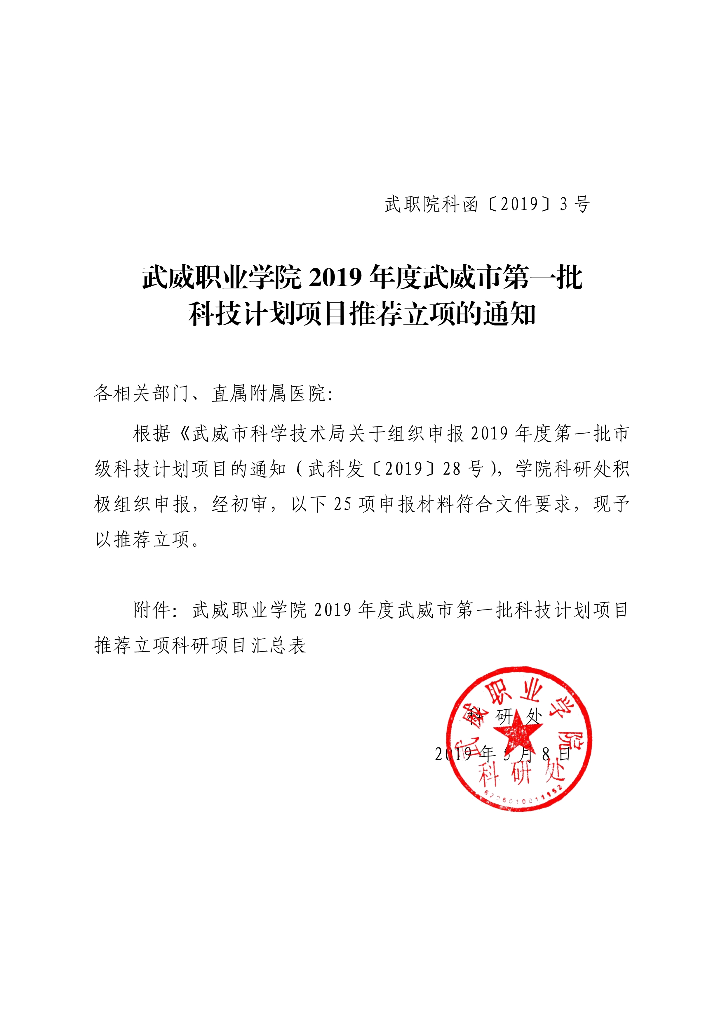 武威職業(yè)學(xué)院2019年度武威市第一批科技計劃項目推薦立項的通知