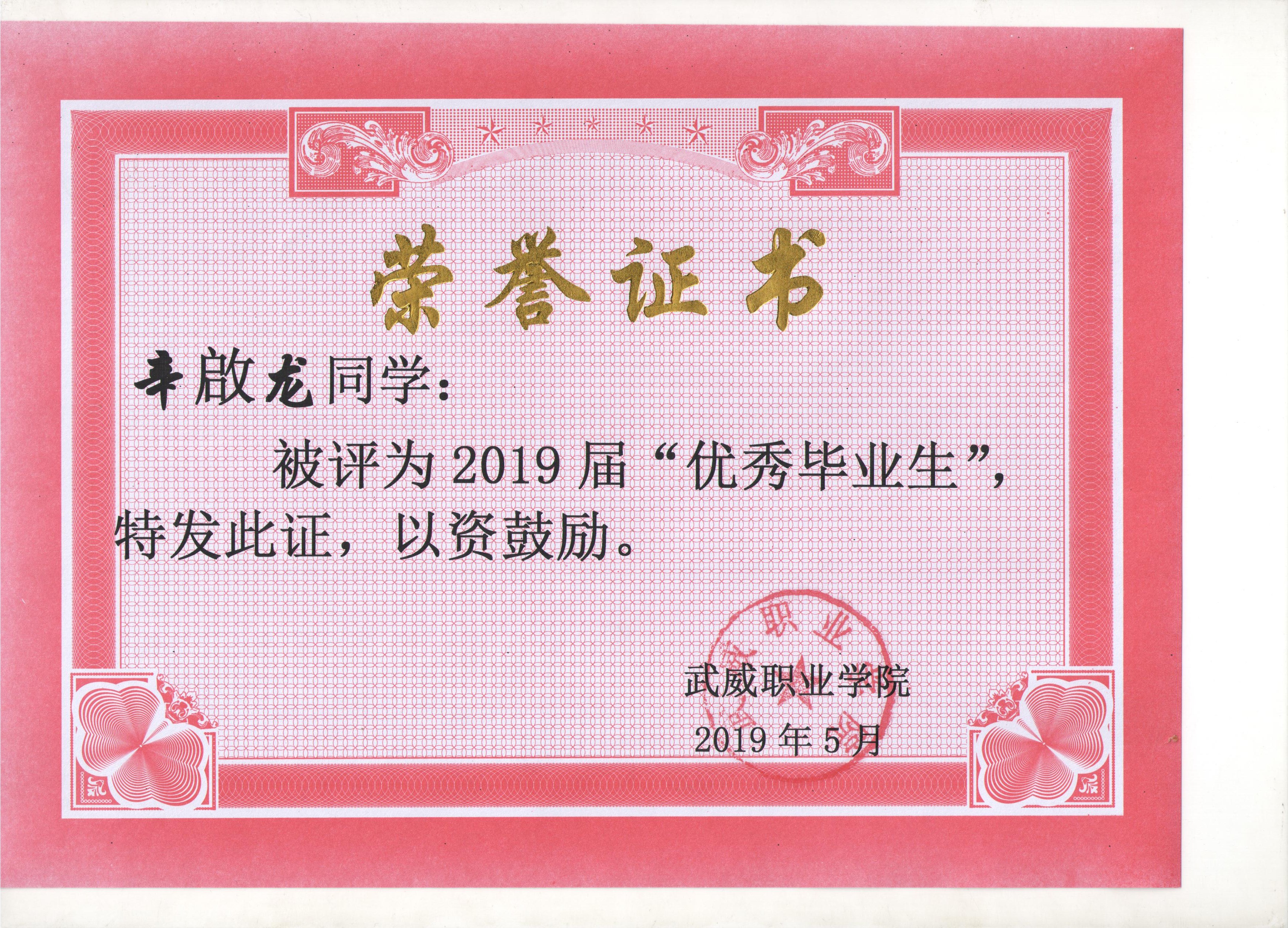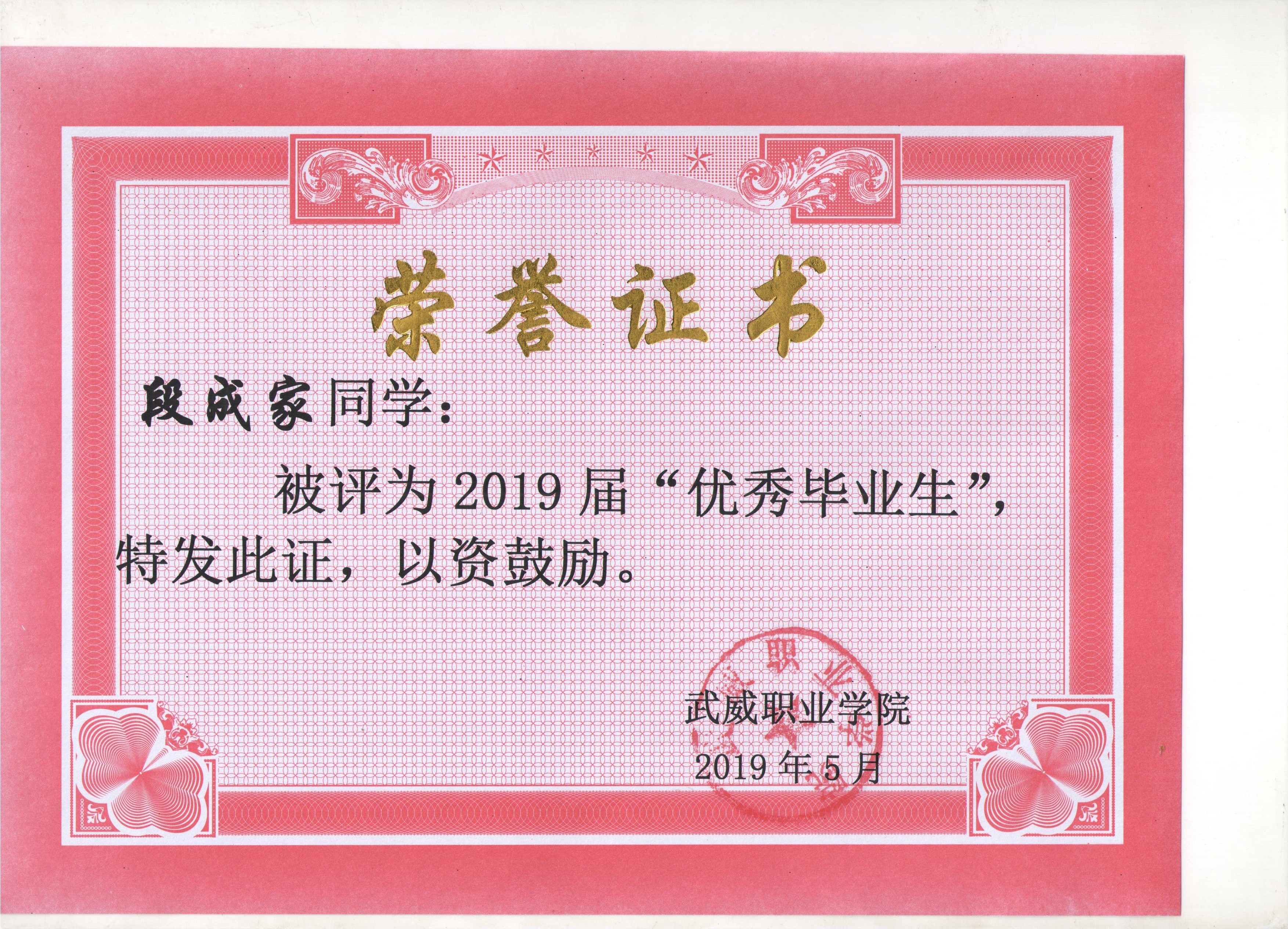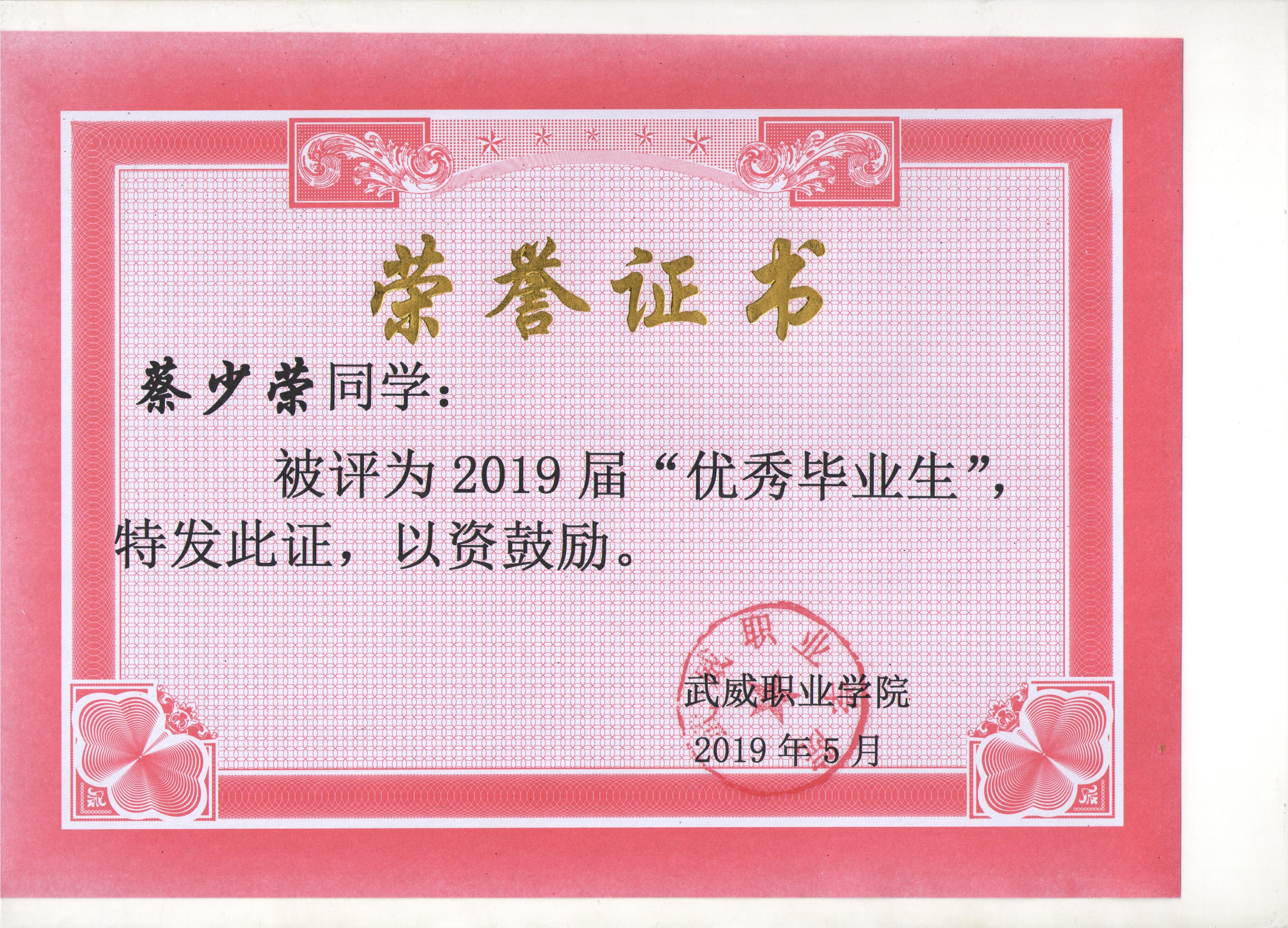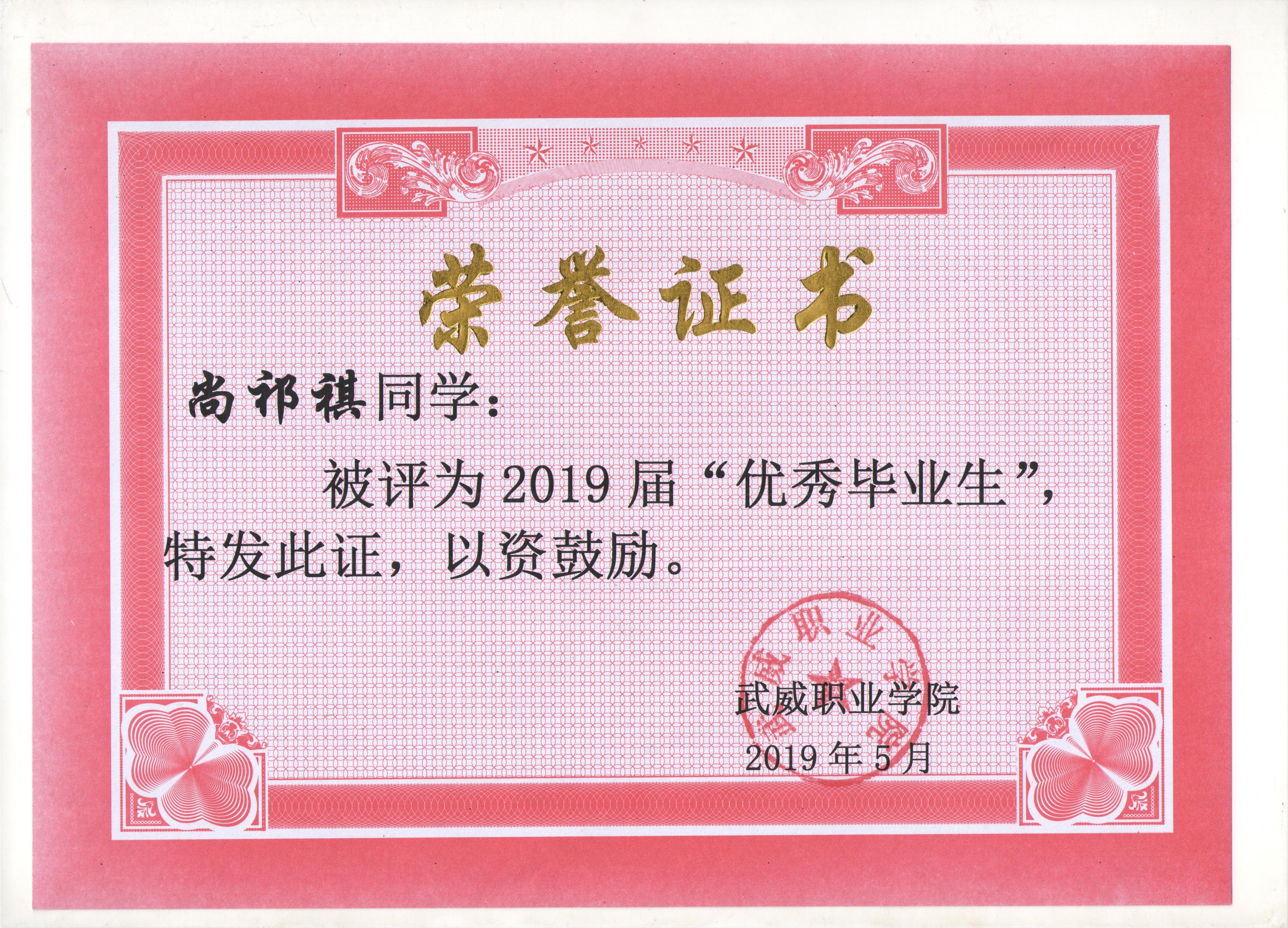 我系蔡少榮等19名同學榮獲武威職業(yè)學院2019屆“優(yōu)秀畢業(yè)生”榮譽稱號