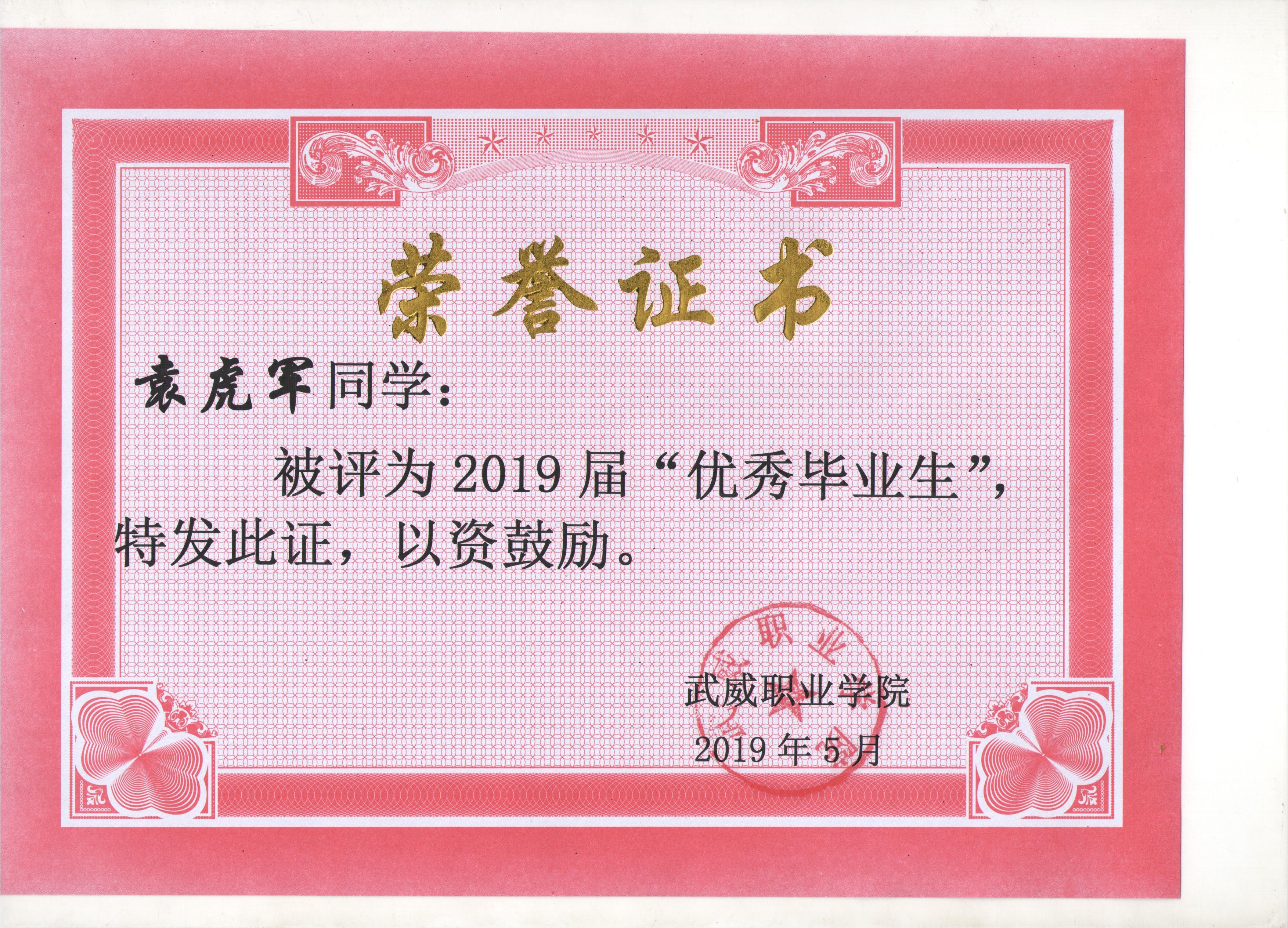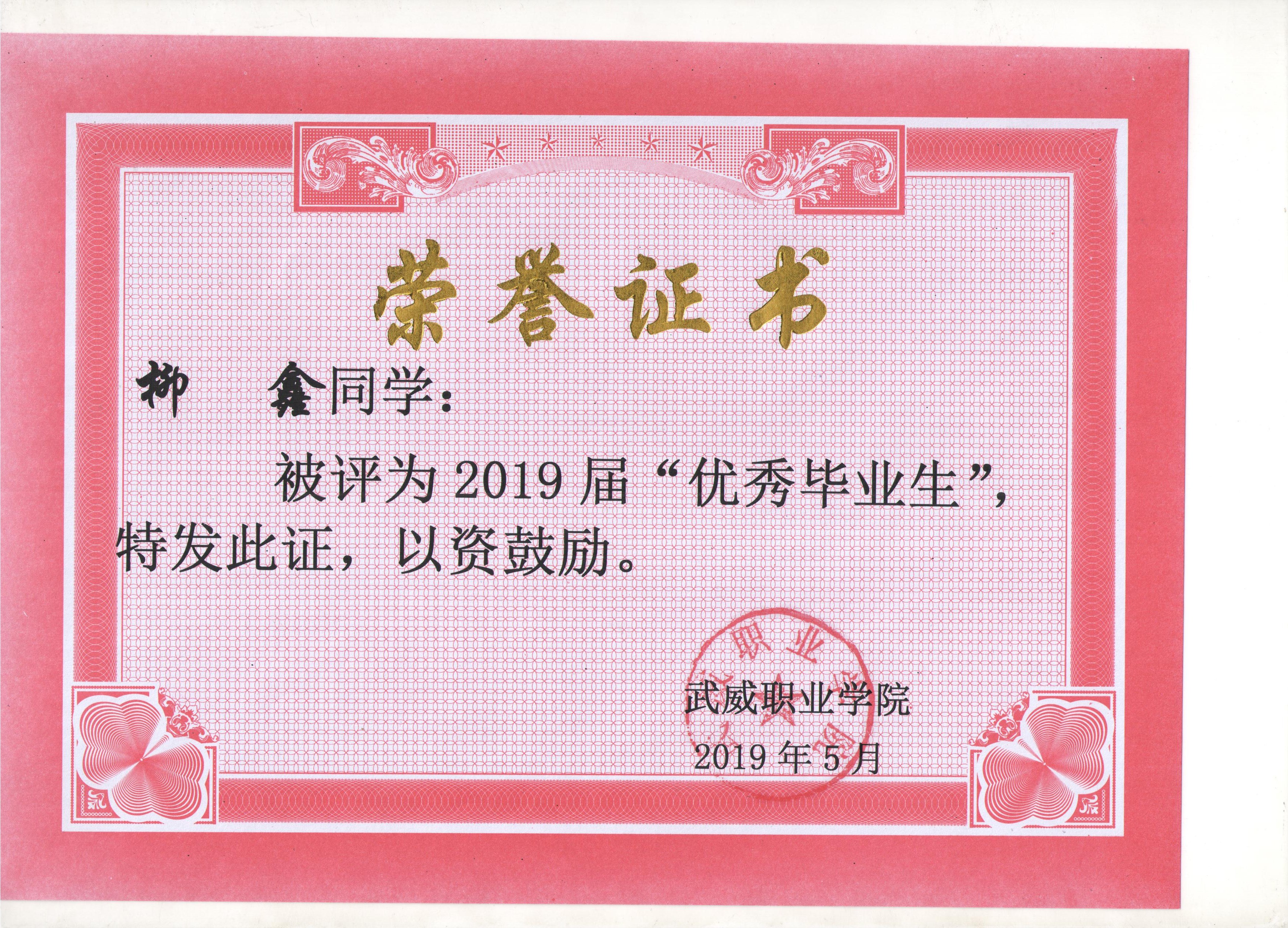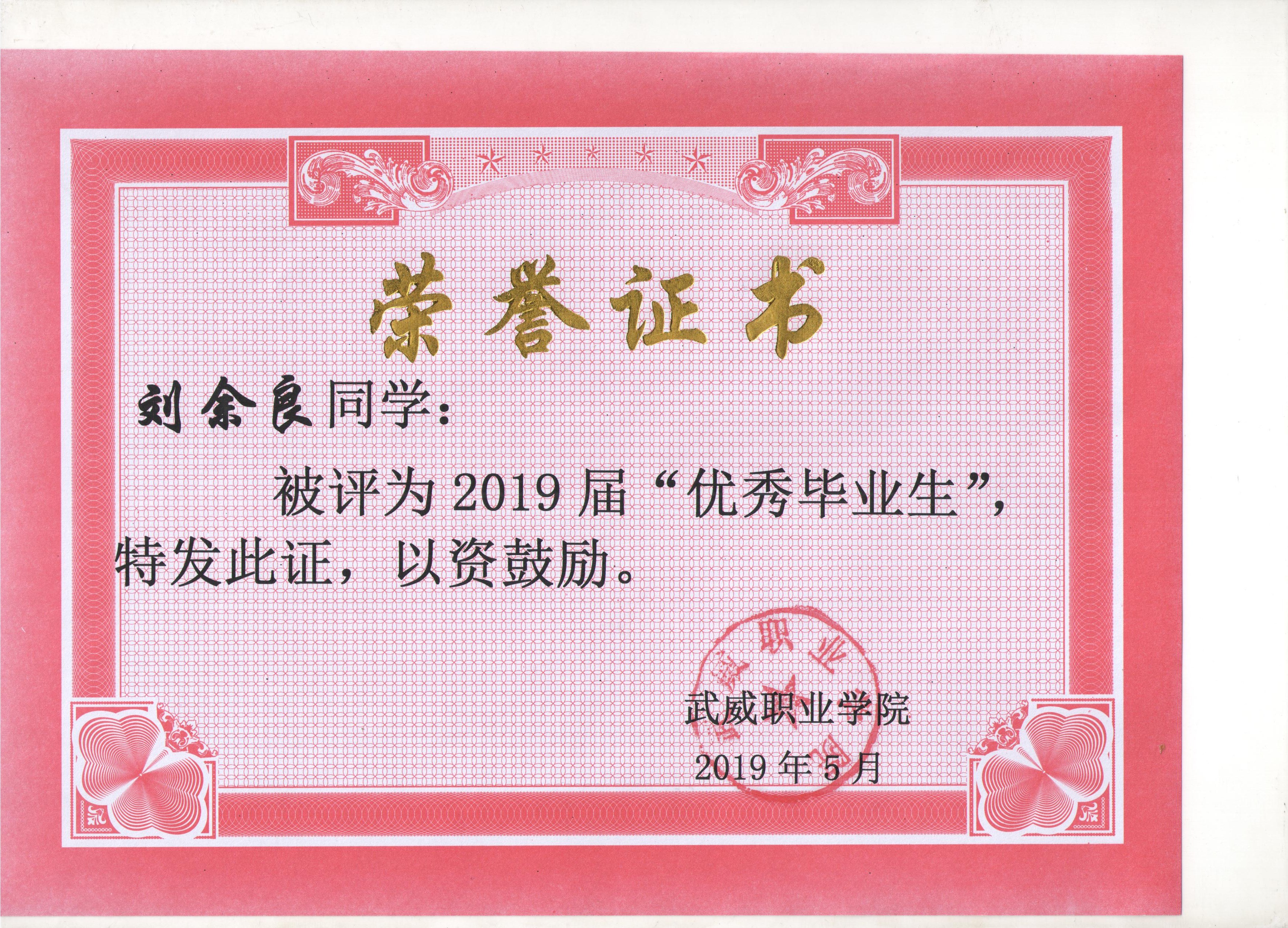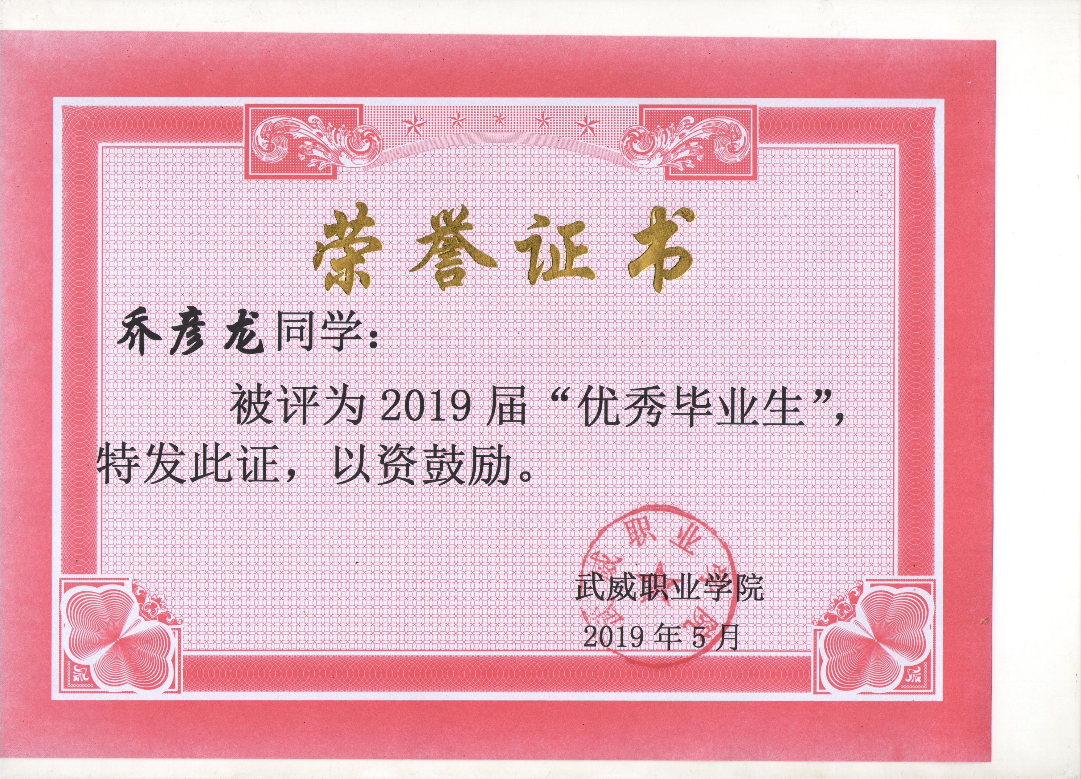 我系蔡少榮等19名同學榮獲武威職業(yè)學院2019屆“優(yōu)秀畢業(yè)生”榮譽稱號
