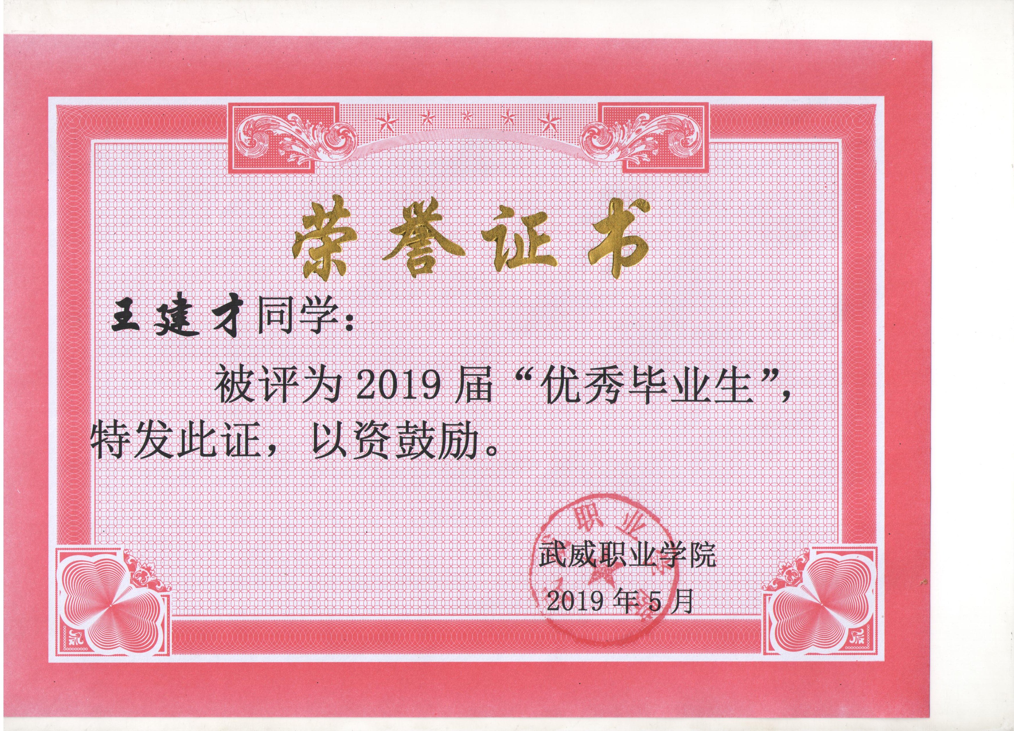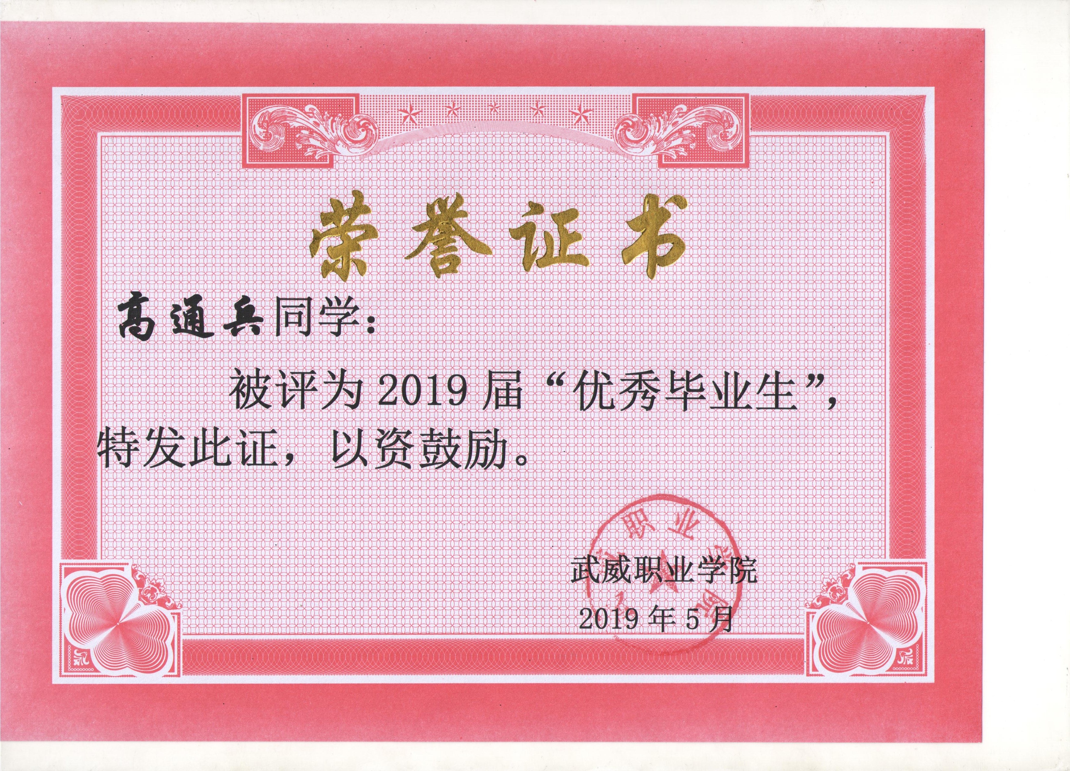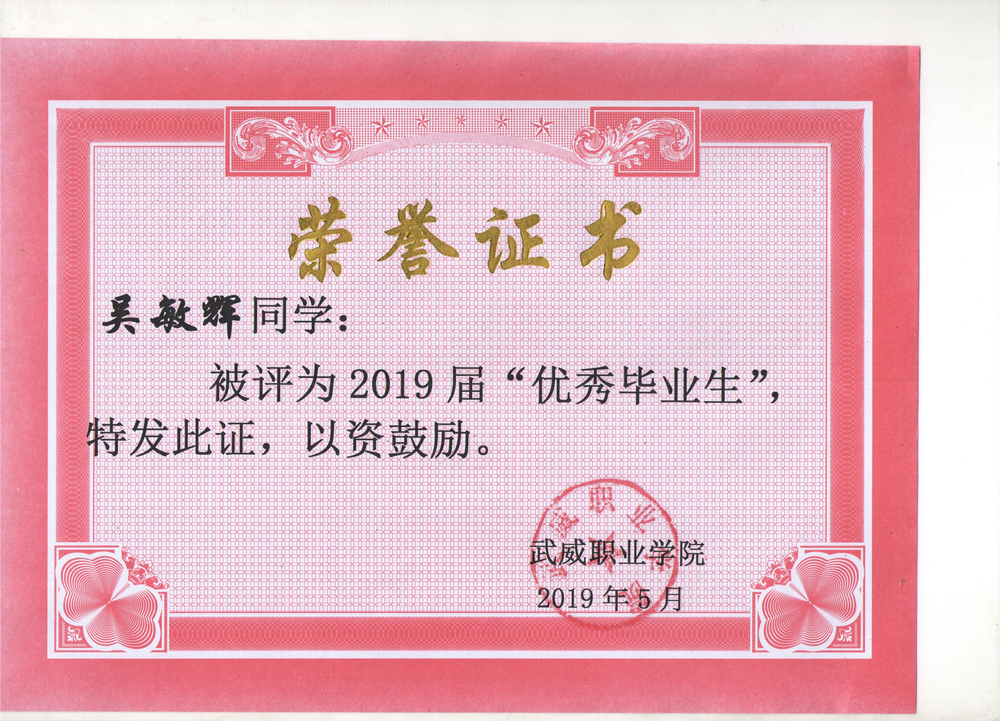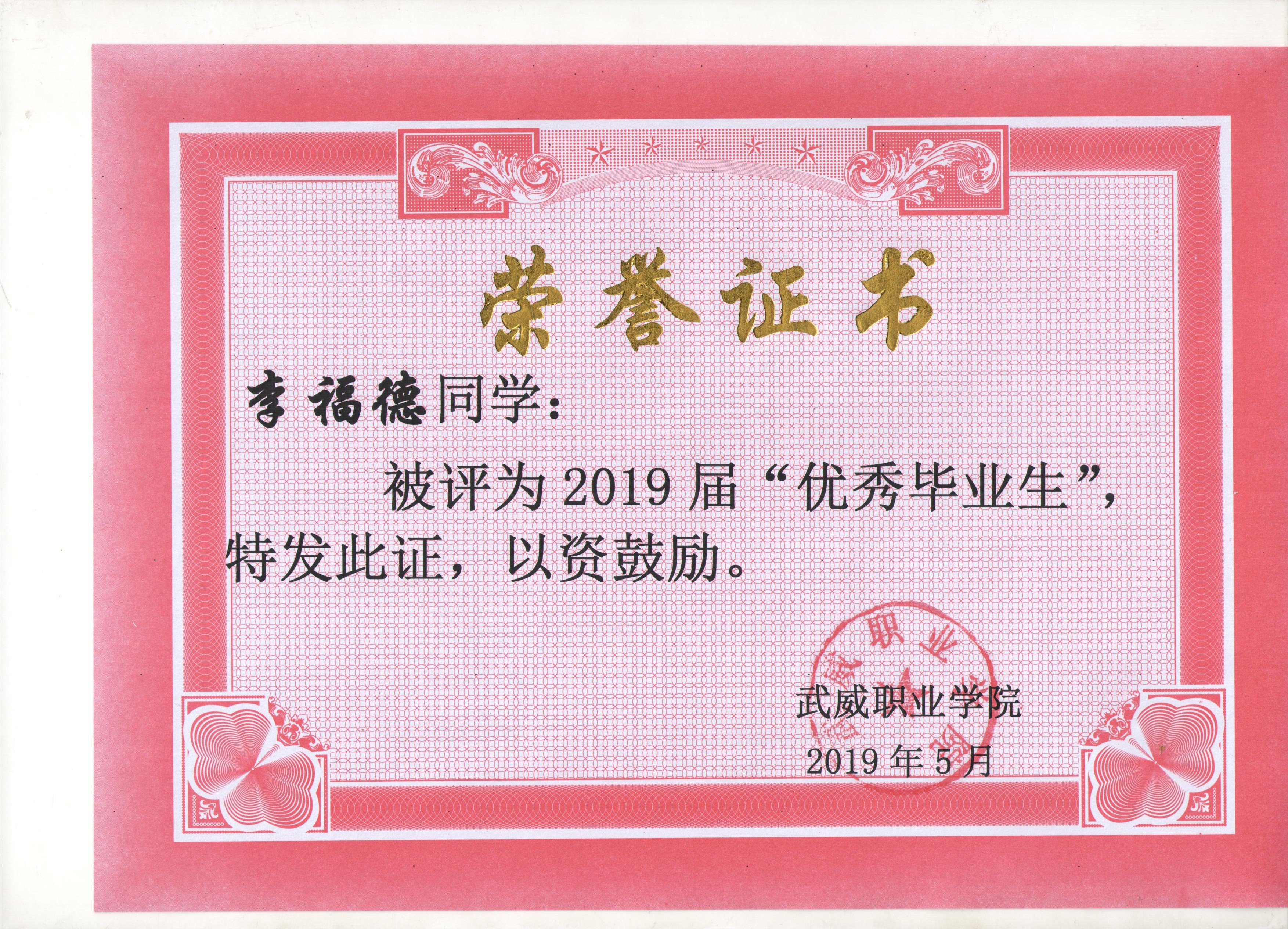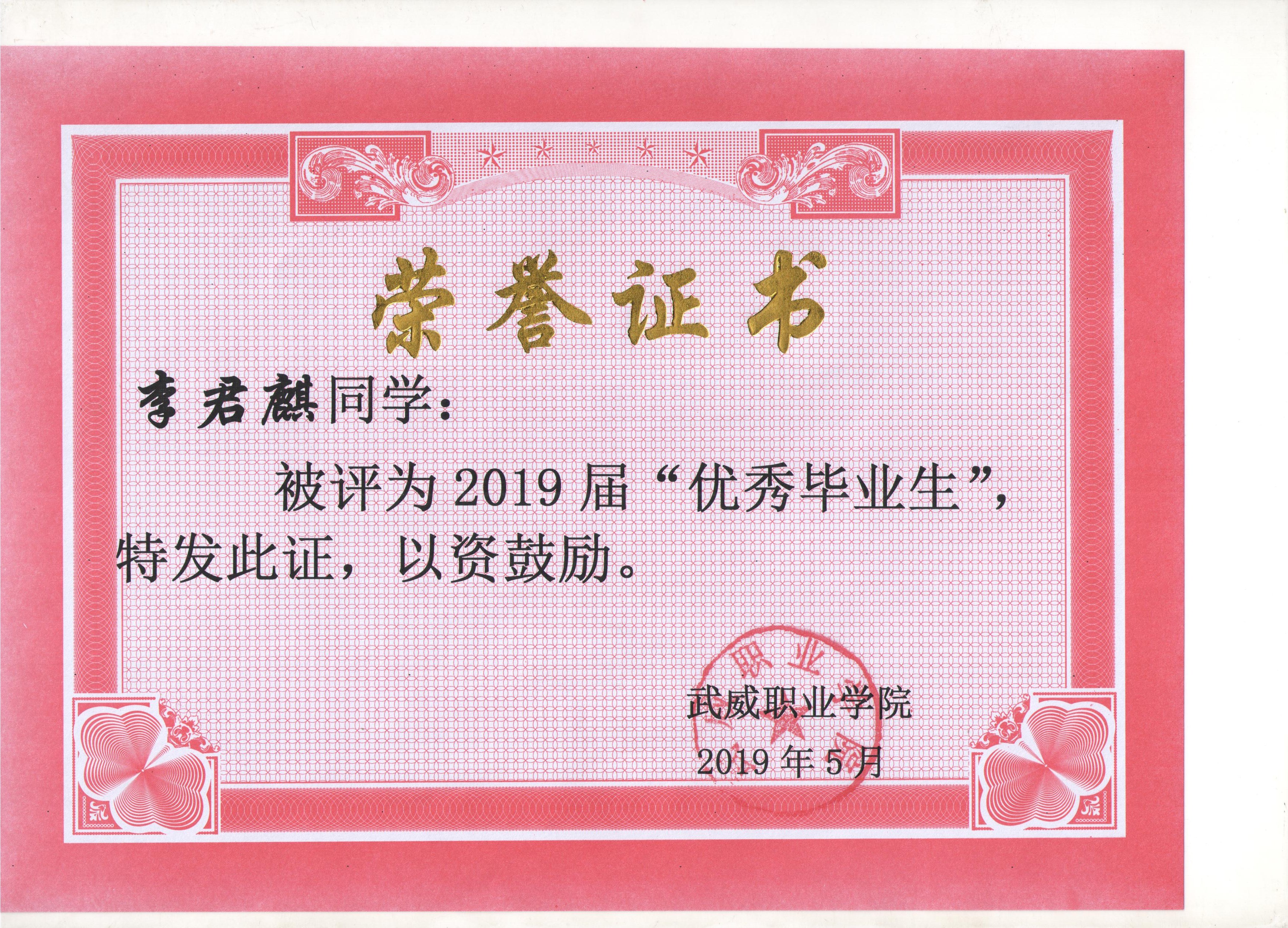 我系蔡少榮等19名同學榮獲武威職業(yè)學院2019屆“優(yōu)秀畢業(yè)生”榮譽稱號