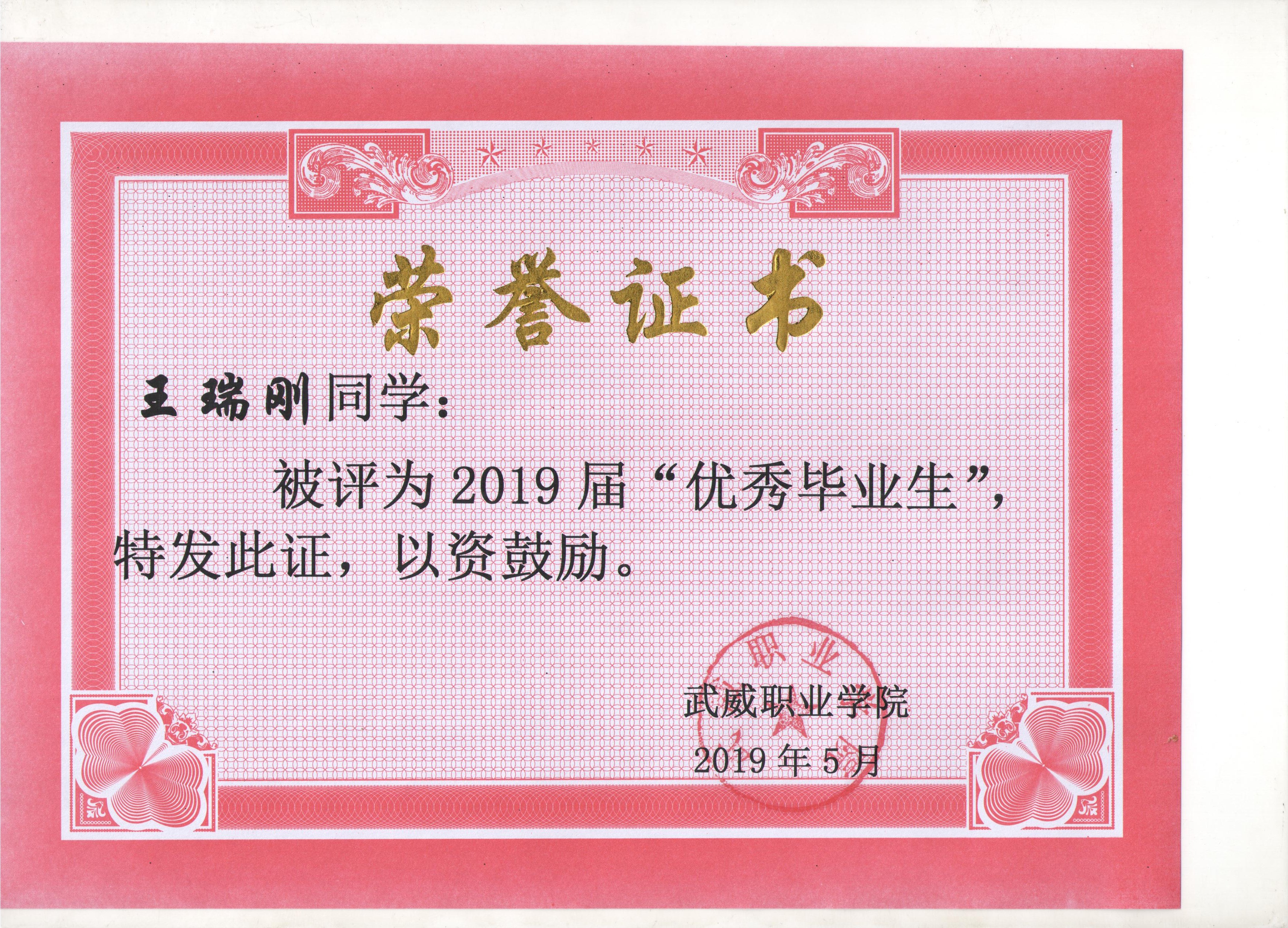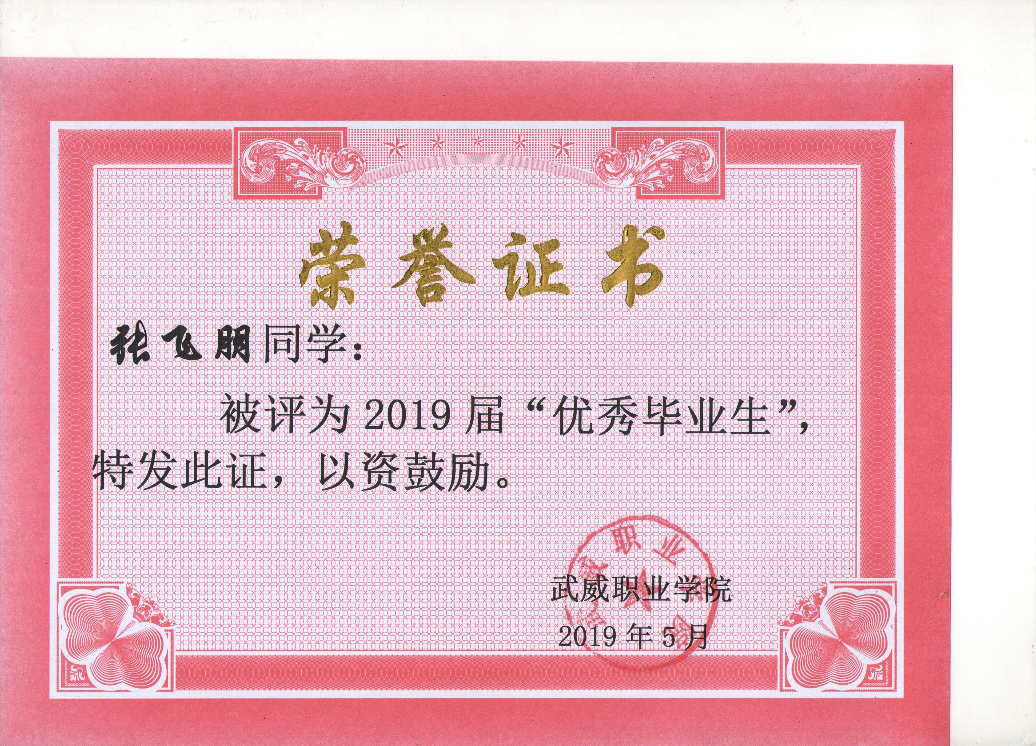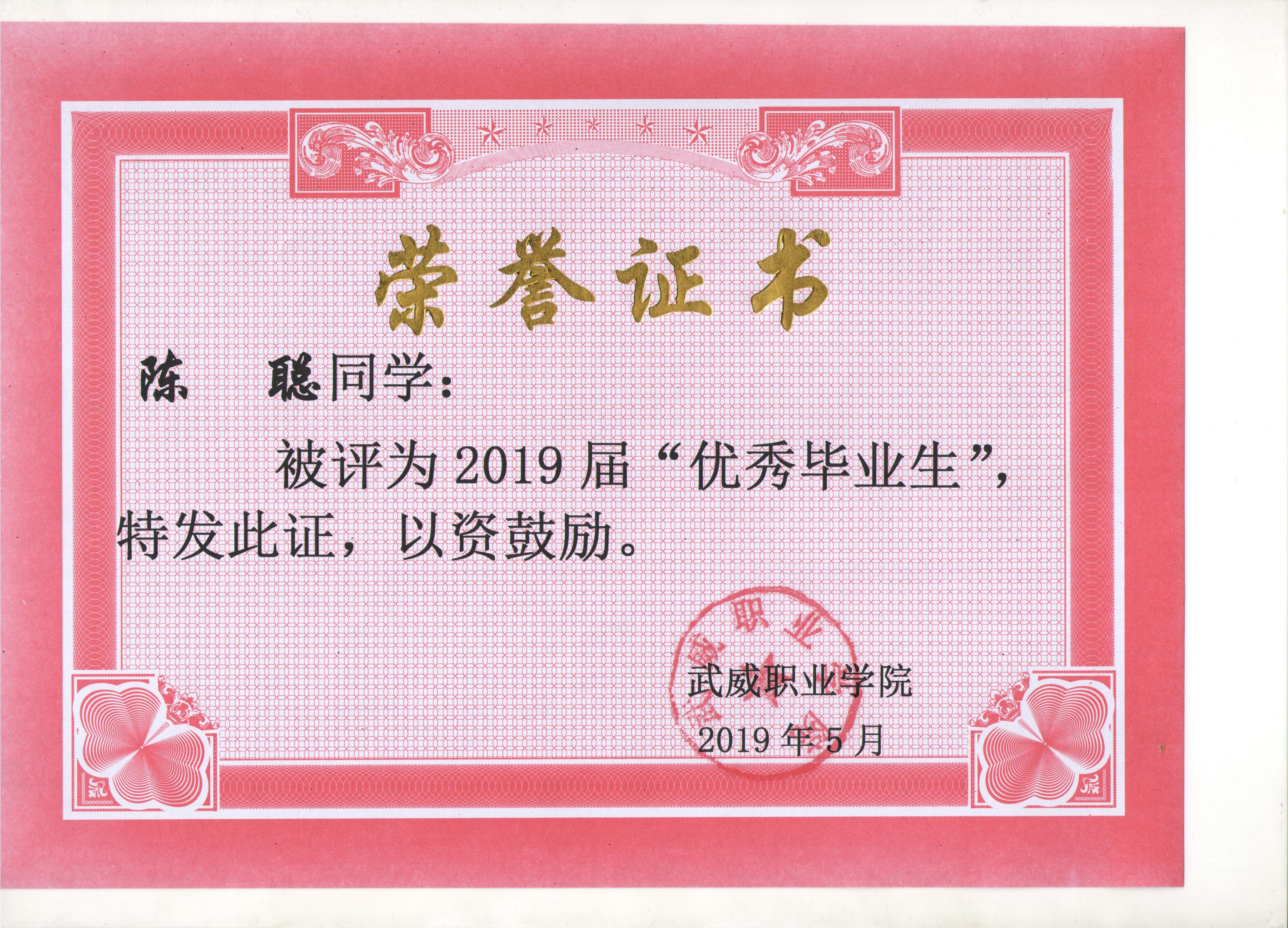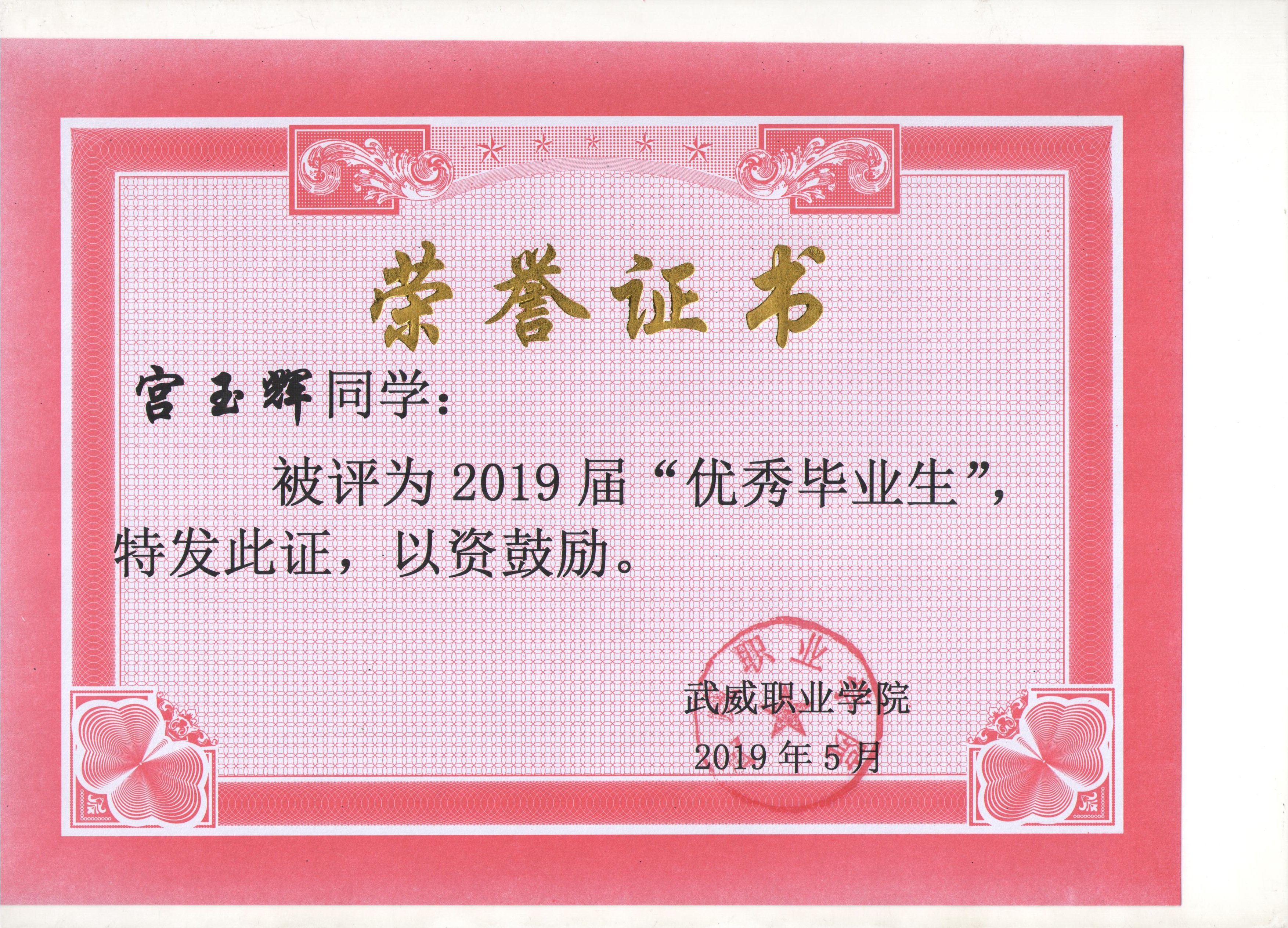 我系蔡少榮等19名同學榮獲武威職業(yè)學院2019屆“優(yōu)秀畢業(yè)生”榮譽稱號