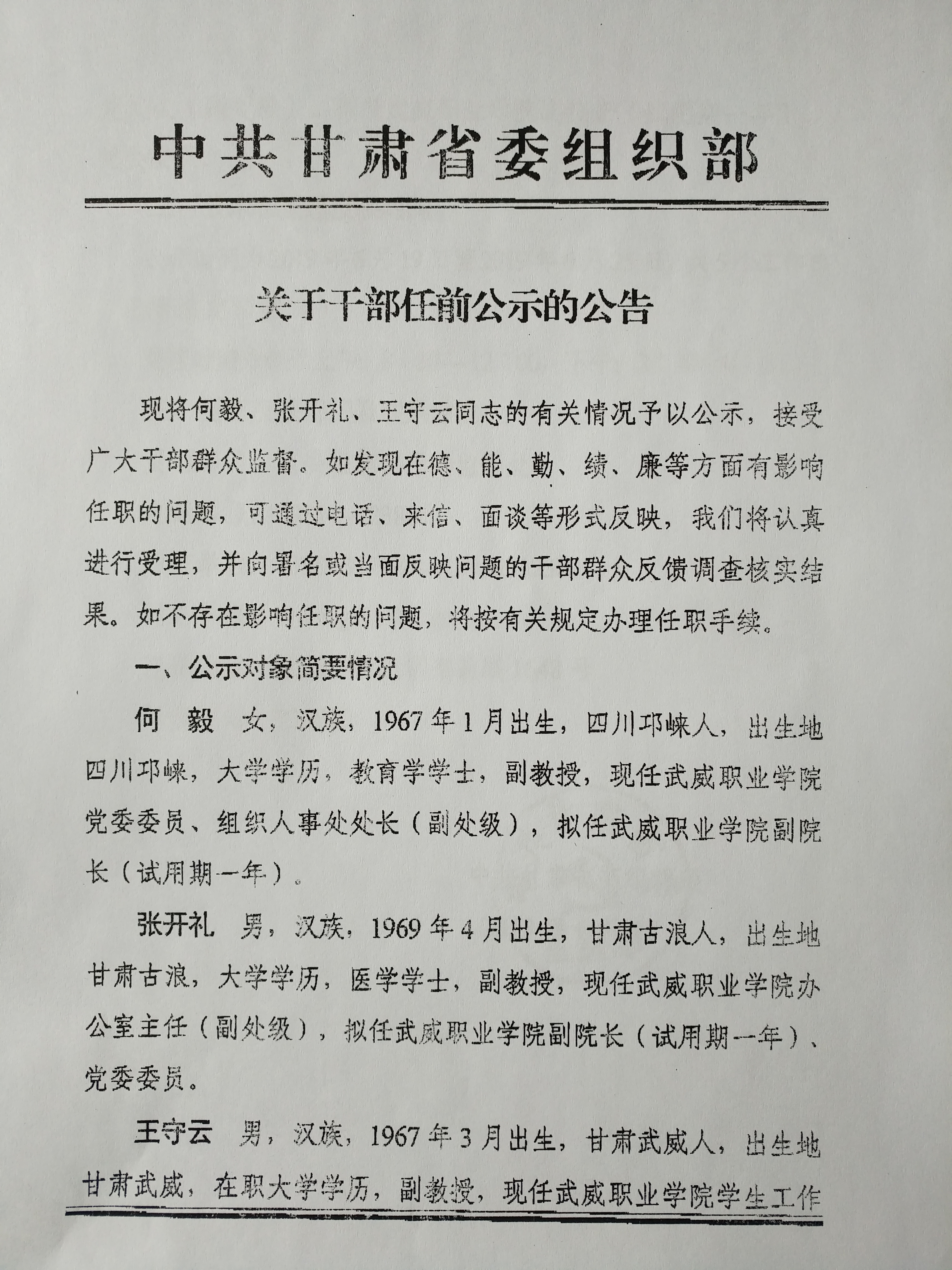 現(xiàn)將省委組織部關(guān)于何毅、張開(kāi)禮、王守云同志的有關(guān)情況予以公示,接受廣大干部群眾監(jiān)督。