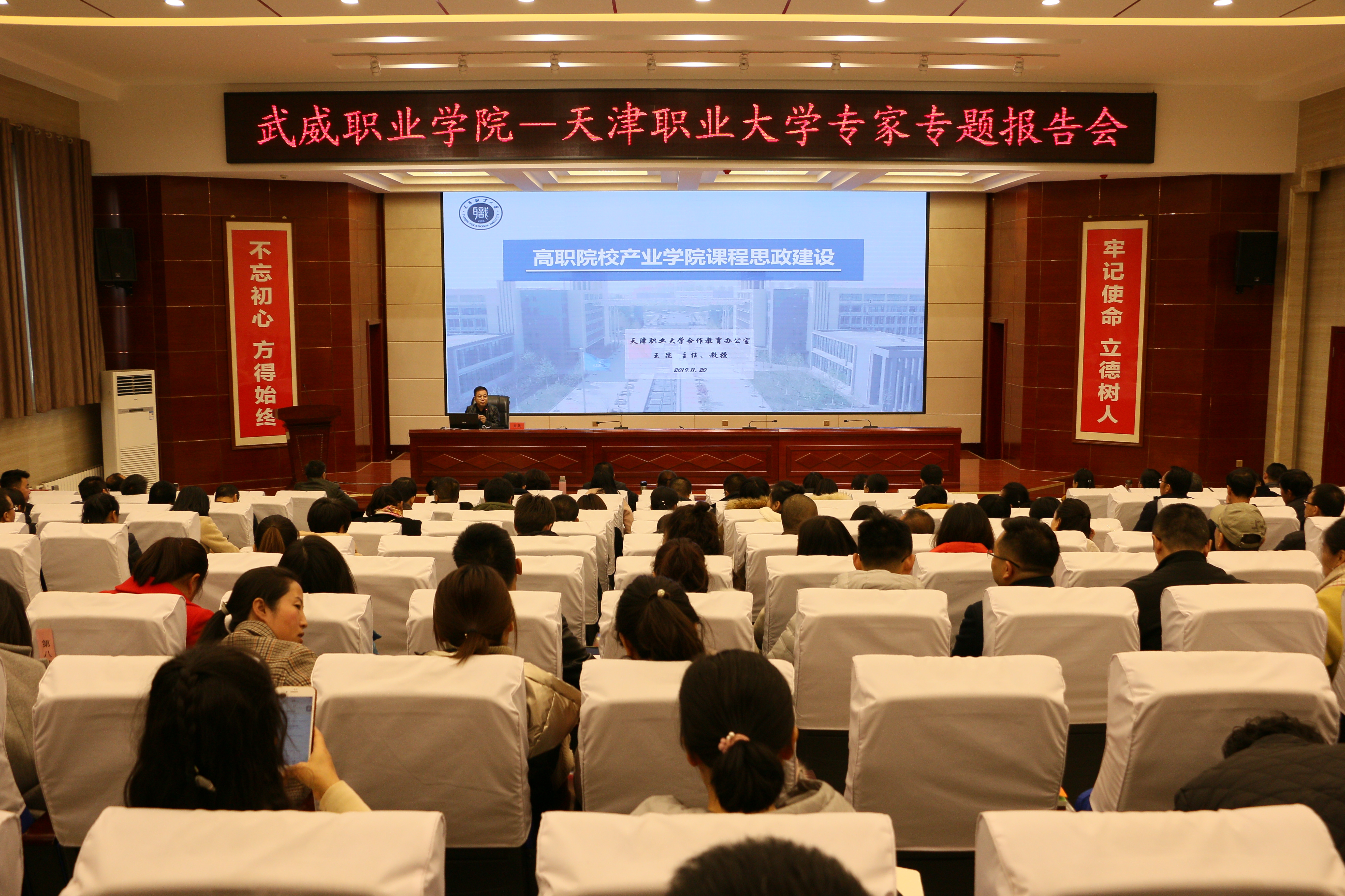 11月20日,武威職業(yè)學(xué)院“綠洲講壇”第29期在學(xué)院菁英廳舉行,本期活動邀請到天津職業(yè)大學(xué)合作教育辦公室主任王昆教授作主題為“高職院校產(chǎn)業(yè)學(xué)院課程思政建設(shè)”的報告。學(xué)院領(lǐng)導(dǎo)班子、中層干部、教師代表220余人參加了報告會。本期講壇由學(xué)院黨委書記、院長趙明主持。
