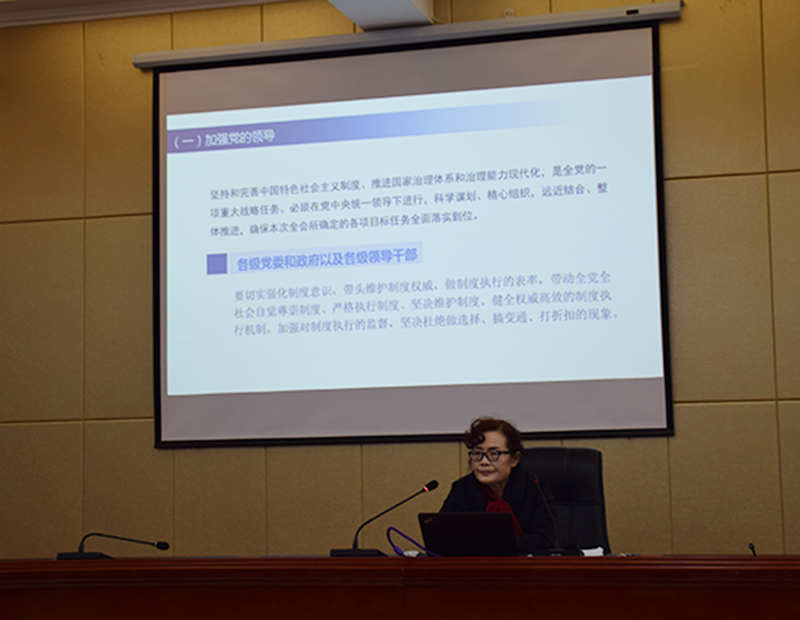 晏素珍以《中共中央關(guān)于堅(jiān)持和完善中國(guó)特色社會(huì)主義制度推進(jìn)國(guó)家治理體系和治理能力現(xiàn)代化若干重大問(wèn)題的決定》的學(xué)習(xí)與解讀為題,重點(diǎn)就全會(huì)召開的背景、意義和看點(diǎn);《決定》的基本框架和主要內(nèi)容以及抓好全會(huì)的學(xué)習(xí)貫徹的具體要求進(jìn)行了宣講。要求廣大師生提高政治站位,樹牢“四個(gè)意識(shí)”,堅(jiān)定“四個(gè)自信”,做到“兩個(gè)維護(hù)”,推動(dòng)全會(huì)精神在全系落地生根、取得扎實(shí)成效。為實(shí)現(xiàn)“兩個(gè)一百年”奮斗目標(biāo),實(shí)現(xiàn)中華民族偉大復(fù)興的中國(guó)夢(mèng)而努力奮斗。