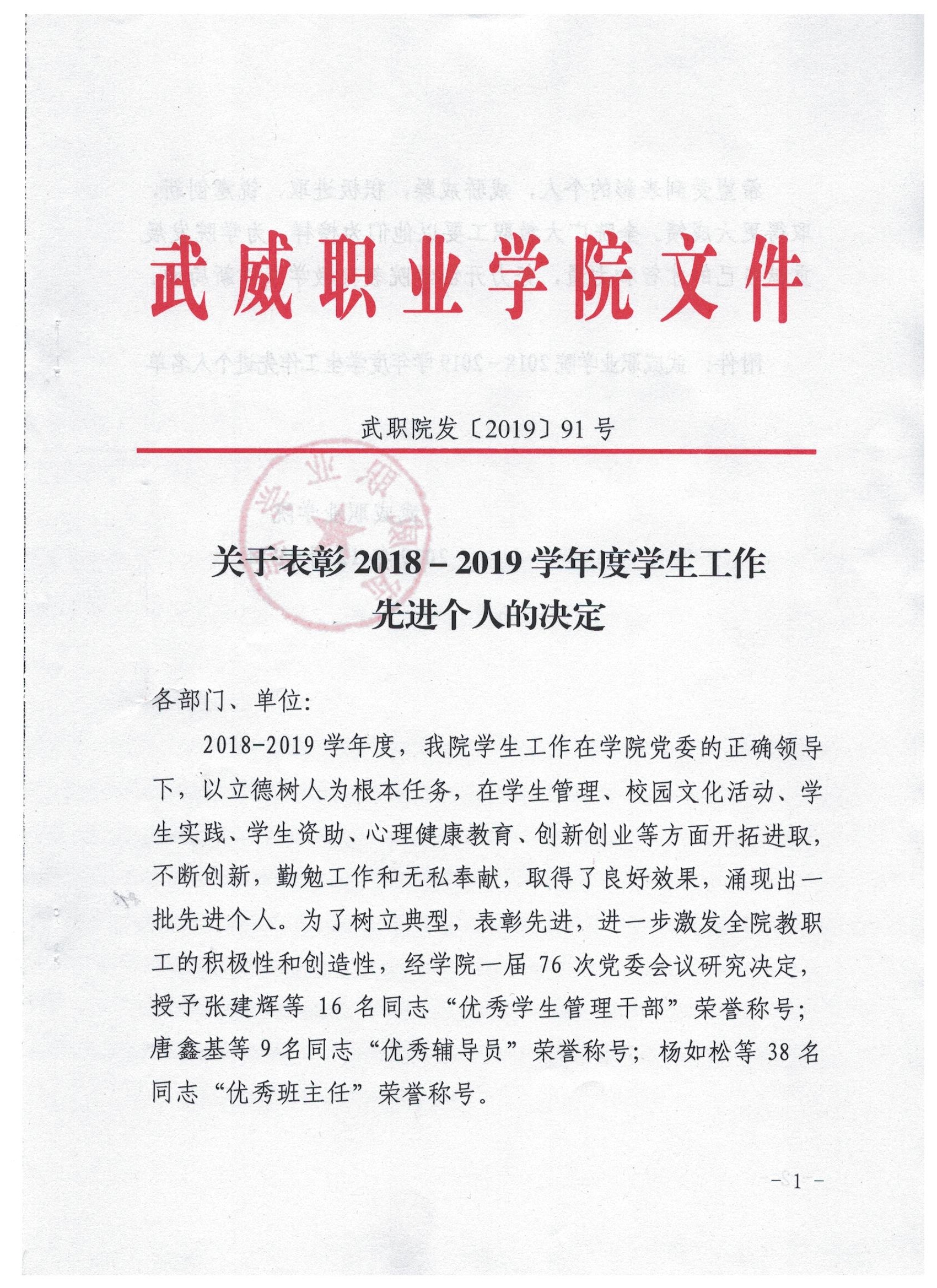 關(guān)于表彰2018-2019學(xué)年度學(xué)生工作先進(jìn)個(gè)人的決定