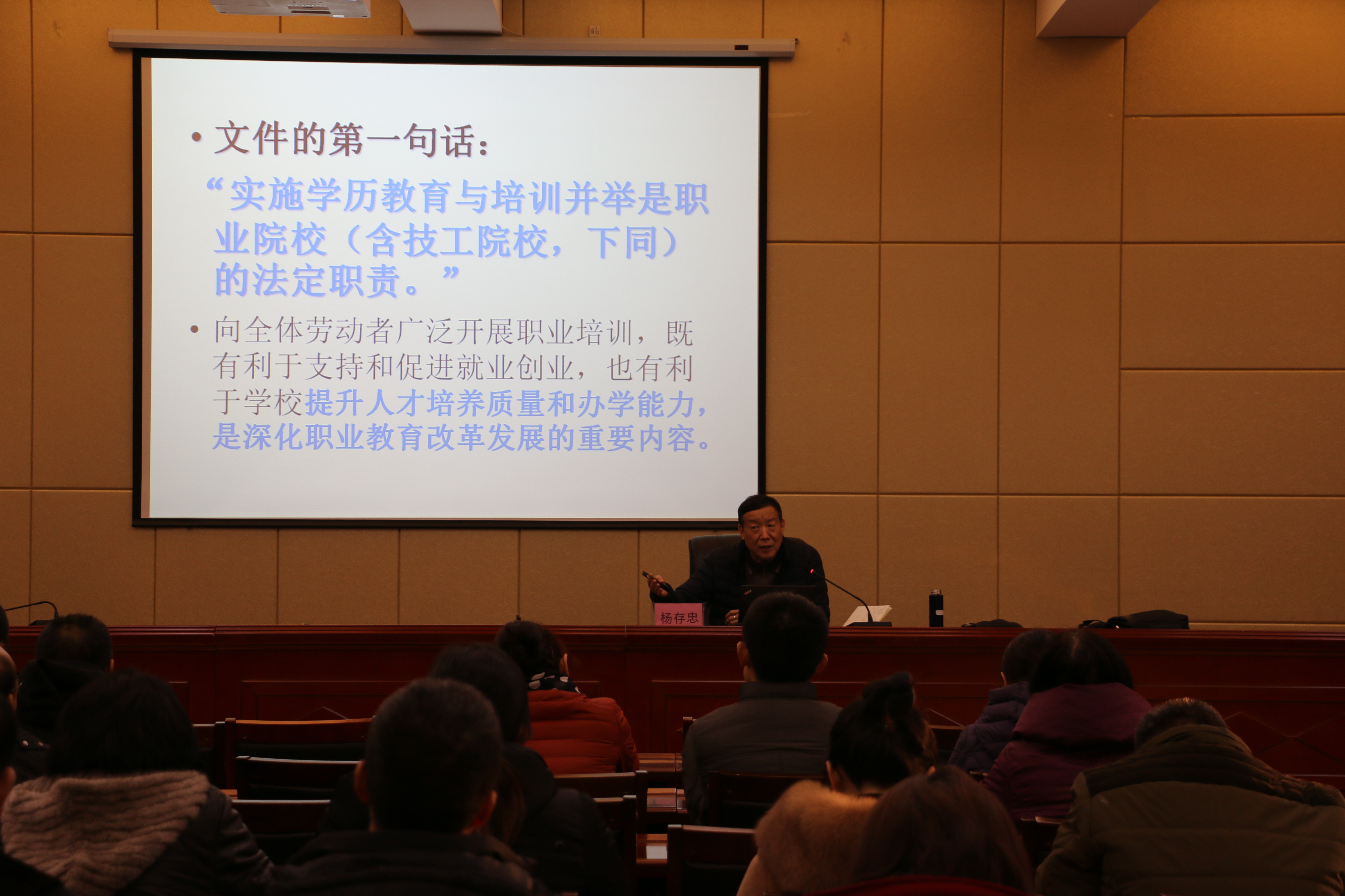 針對(duì)教育部11月25日發(fā)布的“關(guān)于做好《職業(yè)院校全面開(kāi)展職業(yè)培訓(xùn) 促進(jìn)就業(yè)創(chuàng)業(yè)行動(dòng)計(jì)劃》實(shí)施工作有關(guān)事項(xiàng)的通知”的文件(以下簡(jiǎn)稱《行動(dòng)計(jì)劃》),楊教授從《行動(dòng)計(jì)劃》出臺(tái)的背景和意義、職業(yè)院校的法定職責(zé)、職業(yè)院校普遍存在的問(wèn)題、《行動(dòng)計(jì)劃》對(duì)職業(yè)院校提出的重點(diǎn)任務(wù)和行動(dòng)措施以及如何推進(jìn)貫徹落實(shí)《行動(dòng)計(jì)劃》等五個(gè)方面和大家進(jìn)行了學(xué)習(xí)分享。楊教授強(qiáng)調(diào),深化職業(yè)教育改革發(fā)展,職業(yè)院校敞開(kāi)校門,廣泛開(kāi)展培訓(xùn)工作,服務(wù)社會(huì)發(fā)展,是職業(yè)院校的法定責(zé)任,也是學(xué)院可持續(xù)發(fā)展和生存的必然趨勢(shì)?!缎袆?dòng)計(jì)劃》對(duì)職業(yè)院校提出了十個(gè)方面的行動(dòng)措施一是廣泛開(kāi)展企業(yè)職工技能培訓(xùn)。二是積極開(kāi)展面向重點(diǎn)人群的就業(yè)創(chuàng)業(yè)培訓(xùn)。三是大力開(kāi)展失業(yè)人員再就業(yè)培訓(xùn)。四是做好職業(yè)指導(dǎo)和就業(yè)服務(wù)。五是推進(jìn)培訓(xùn)資源建設(shè)和模式改革。六是加強(qiáng)培訓(xùn)師資隊(duì)伍建設(shè)。七是支持多方合作共建培訓(xùn)實(shí)訓(xùn)基地。八是完善職業(yè)院校開(kāi)展培訓(xùn)的激勵(lì)政策。九是健全參訓(xùn)人員的支持鼓勵(lì)政策。十是建立培訓(xùn)評(píng)價(jià)與考核機(jī)制。楊教授希望大家能夠?qū)W好文件并認(rèn)真思考學(xué)院的改革發(fā)展。把立德樹人、服務(wù)發(fā)展、促進(jìn)就業(yè)、適應(yīng)需求的辦學(xué)理念傳承下去。