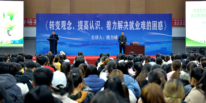 為貫徹2020屆全國普通高校畢業(yè)生就業(yè)創(chuàng)業(yè)工作網(wǎng)絡(luò)視頻會(huì)議精神,學(xué)院以習(xí)近平新時(shí)代中國特色社會(huì)主義思想為指導(dǎo),深入落實(shí)黨中央、國務(wù)院關(guān)于促進(jìn)高校畢業(yè)生就業(yè)創(chuàng)業(yè)的一系列重大決策部署,把畢業(yè)生就業(yè)工作擺在最突出位置,確保畢業(yè)生就業(yè)大局穩(wěn)定。12月14日上午,學(xué)院組織2020屆畢業(yè)生,在體育館參加了題為《轉(zhuǎn)變觀念,提高認(rèn)識(shí),著力解決就業(yè)難得困惑》的專家講座,引導(dǎo)畢業(yè)生轉(zhuǎn)變觀念、積極就業(yè)。講座由省人社廳人力資源市場檔案管理部部長姚力峰主講,招生就業(yè)處副處長董鵬主持。