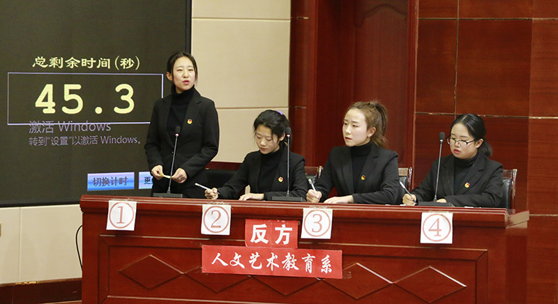為慶祝中華人民共和國成立70周年,深入推進“不忘初心、牢記使命”主題教育活動扎實開展,進一步豐富校園文化生活,拓展大學生思辨能力,培養(yǎng)同學們的團隊合作精神,提高學生綜合素質,展現青年學生昂揚向上的青春風采和精神風貌,院團委舉辦了學院第十一屆大專辯論賽。12月24日晚,辯論賽決賽在大學生活動中心菁英廳舉行,200多名師生觀看了比賽。