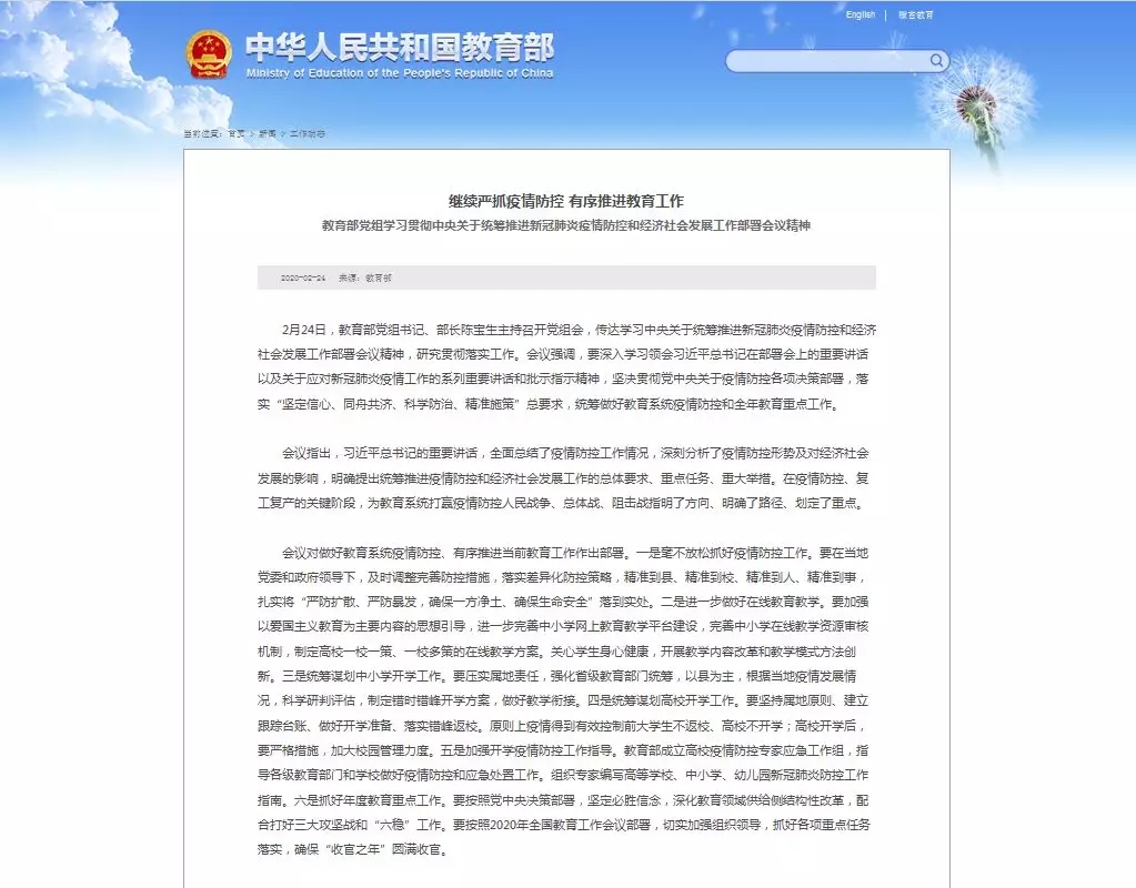 2月24日,教育部黨組書(shū)記、部長(zhǎng)陳寶生主持召開(kāi)黨組會(huì),提出各地要以縣為主,根據(jù)當(dāng)?shù)匾咔榘l(fā)展情況,科學(xué)研判評(píng)估,制定中小學(xué)錯(cuò)時(shí)錯(cuò)峰開(kāi)學(xué)方案,做好教學(xué)銜接。原則上疫情得到有效控制前大學(xué)生不返校、高校不開(kāi)學(xué);高校開(kāi)學(xué)后,要嚴(yán)格措施,加大校園管理力度。