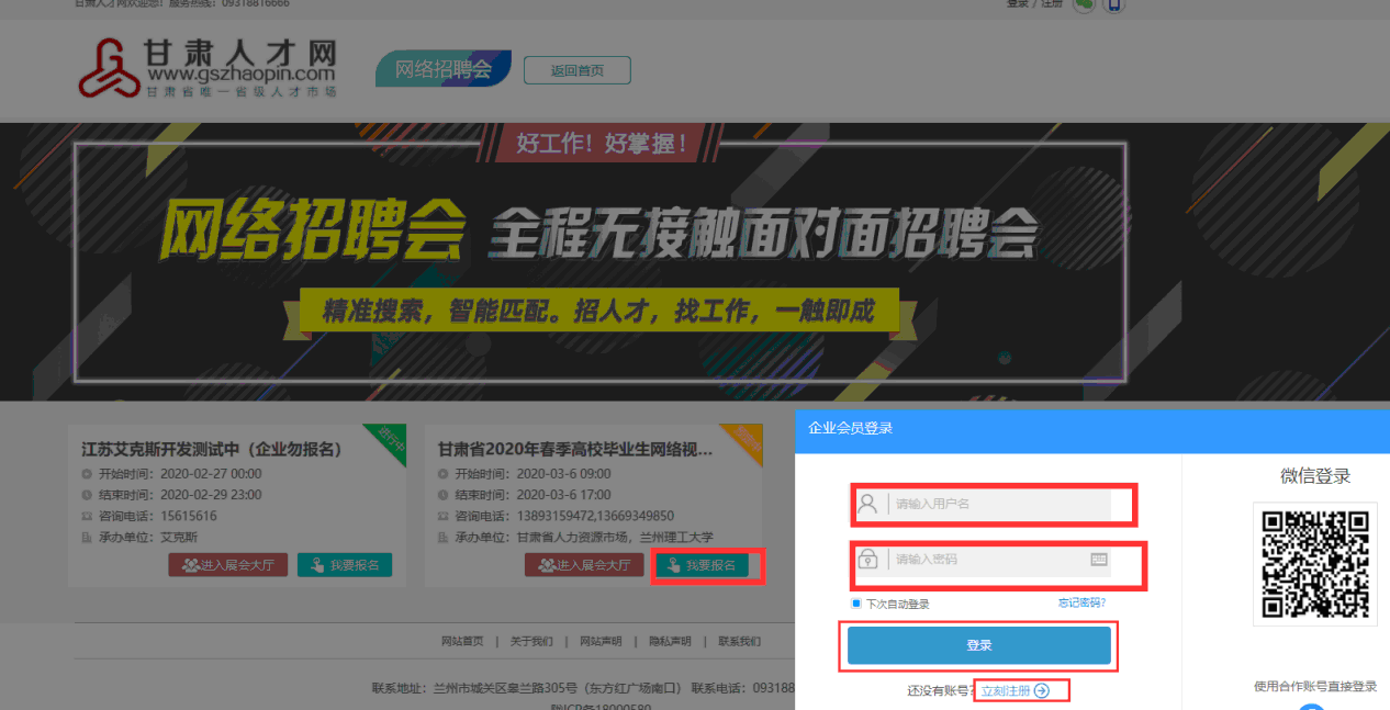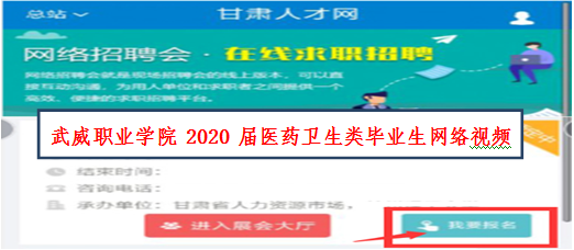 1.登錄甘肅人才網(wǎng)(www.gszhaopin.com),點(diǎn)擊菜單欄“招聘會”—“網(wǎng)絡(luò)招聘會”進(jìn)入二級頁面菜單,進(jìn)入網(wǎng)絡(luò)招聘會列表—選擇“武威職業(yè)學(xué)院2020屆醫(yī)藥衛(wèi)生類畢業(yè)生網(wǎng)絡(luò)視頻雙選會”點(diǎn)擊“我要報名”按鈕,登錄企業(yè)后臺(無賬號點(diǎn)擊“立即注冊”,資質(zhì)通過審核后再報名),待定審核。