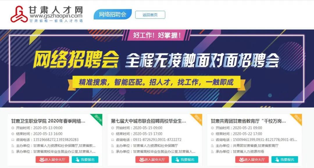 為應(yīng)對新冠肺炎疫情沖擊,加大高校畢業(yè)生就業(yè)服務(wù)力度,進(jìn)一步做好高校畢業(yè)生就業(yè)服務(wù)工作,甘肅省高校畢業(yè)生就業(yè)辦公室、甘肅省人力資源市場定于2020年5月15日聯(lián)合甘肅省內(nèi)部分高校在甘肅人才網(wǎng)(www.gszhaopin.com)舉辦“第七屆大中城市聯(lián)合招聘高校畢業(yè)生春季網(wǎng)絡(luò)視頻專場招聘會‘甘肅站’”活動。
