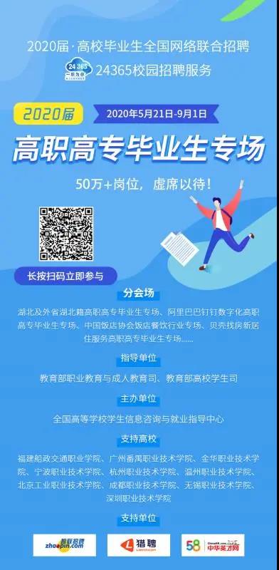 為了進(jìn)一步促進(jìn)2020屆高職高專畢業(yè)生就業(yè),教育部高校學(xué)生司和職業(yè)教育與成人教育司聯(lián)合推出“高職高專畢業(yè)生專場招聘會”,首批推出崗位超過50萬個(gè)。畢業(yè)生可登錄教育部大學(xué)生就業(yè)網(wǎng)(新職業(yè)網(wǎng)www.ncss.cn)或直接掃描宣傳頁中的二維碼參與活動。