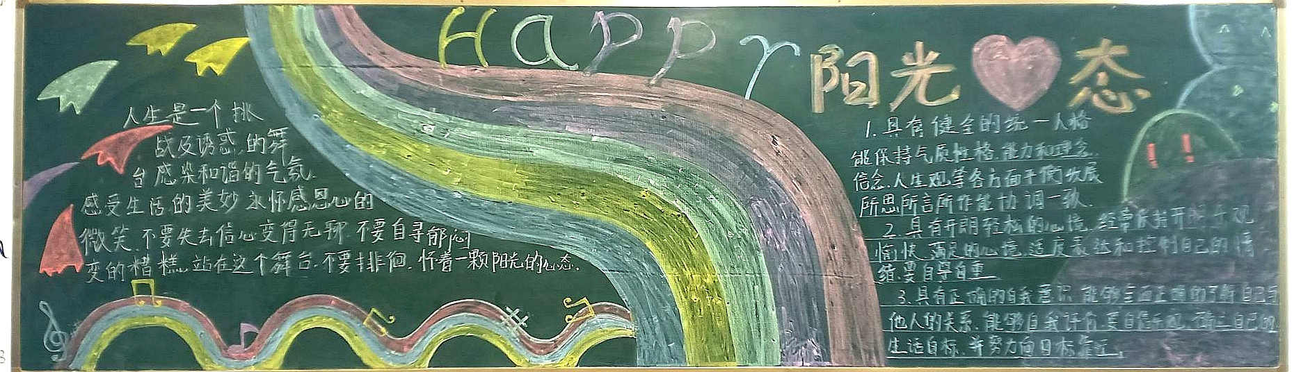 為進(jìn)一步提高大學(xué)生的心理素質(zhì),促進(jìn)大學(xué)生的身心健康和諧,宣傳普及心理健康知識(shí),深入開展心理健康教育,我系結(jié)合學(xué)院特點(diǎn),突出專業(yè)優(yōu)勢,在積極承擔(dān)和參與學(xué)校心理健康活動(dòng)月的團(tuán)日活動(dòng)的同時(shí),各班開展了豐富多彩的以“心理健康”為主題的黑板報(bào)。