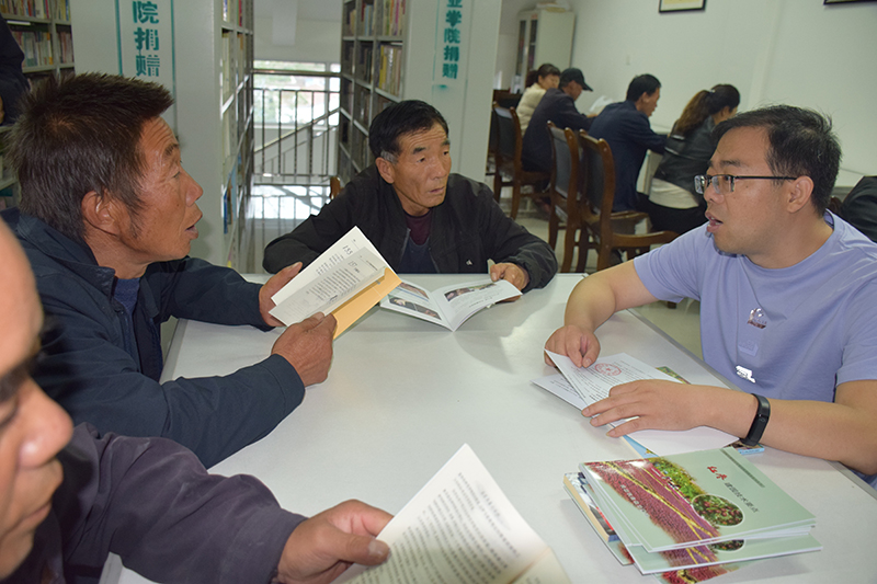“扶貧先扶智”,晏素珍帶領(lǐng)黨員教師為黑松驛鎮(zhèn)的農(nóng)戶贈送了種植養(yǎng)殖及產(chǎn)業(yè)扶貧結(jié)合密切的圖書,之后來到了圖書閱覽室共同交流研討種植養(yǎng)殖的技術(shù)問題,同時還召開了座談會,就農(nóng)戶急需解決的問題進行了詳細的講解。