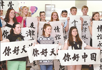 ④ 6月10日,在天津國際漢語學(xué)院,參與“妙筆練書法”活動的蘇格蘭師生展示自己的作品。