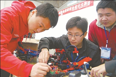 ⑥4月12日,江蘇科技大學(xué)舉辦首屆慧魚機器人拼裝組合設(shè)計大賽,圖為大學(xué)生在進行機器人拼裝比賽。