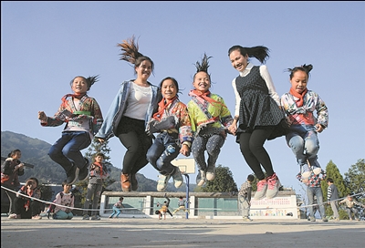 ⑤ 廣西柳州市融水苗族自治縣大年鄉(xiāng)高馬村小學(xué)師生一起開展體育活動。