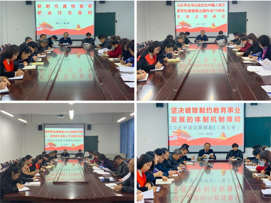 黃文源領(lǐng)學(xué)了《習(xí)近平談治國理政》(第三卷)第十二條 提高保障和改善民生水平——堅(jiān)決破除制約教育事業(yè)發(fā)展的體質(zhì)機(jī)制障礙,解讀了《新時代高校教師職業(yè)行為十項(xiàng)準(zhǔn)則》,要求所有教師要做以德立身、以德立學(xué)、以德施教、以德育德的楷模。楊如松領(lǐng)學(xué)了《習(xí)近平總書記教育重要論述講義》第二講 培養(yǎng)擔(dān)當(dāng)民族復(fù)興大任的時代新人——堅(jiān)持把立德樹人作為根本任務(wù)。楊建紅老師領(lǐng)學(xué)了習(xí)近平總書記在紀(jì)念中國 人民志愿軍抗美援朝出國作戰(zhàn)70周年大會的講話。