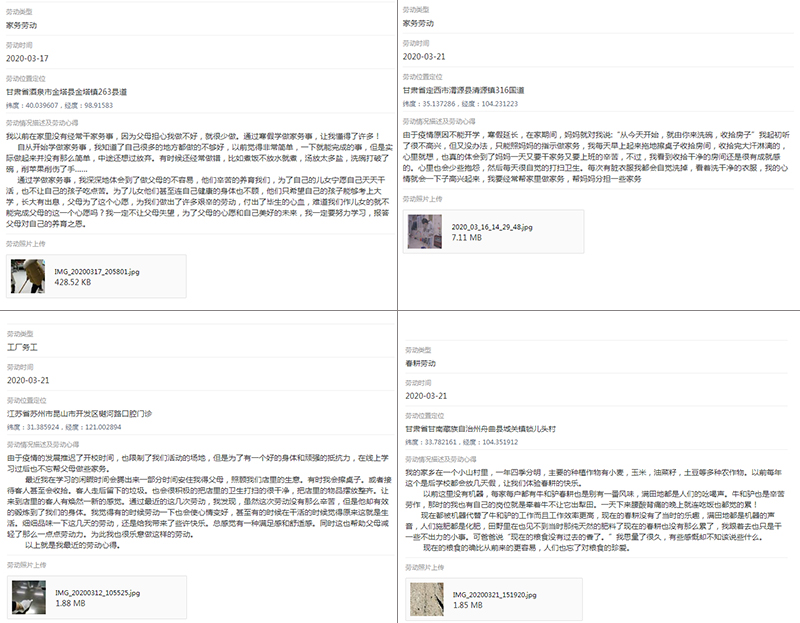 結(jié)合同學們生活和學習實際,學工處要求廣大同學積極參與志愿服務(wù)、春耕勞動、工廠務(wù)工、家務(wù)勞動等方面勞動實踐,完成每周不少于2小時的實踐鍛煉,并通過信息化平臺上報活動照片和勞動心得。