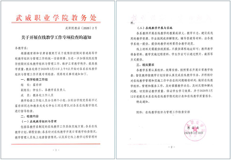 各院系及相關部門要按照教育部和省教育廳關于疫情防控期間在線教學工作的文件精神和《武威職業(yè)學院新型冠狀病毒肺炎疫情防控期間在線教學工作實施方案》的相關要求進行全面自查,做到文件精神及要求全部落實到位、不打折扣;對執(zhí)行情況進行認真總結,通過自查深入挖掘現階段在線教學實施和組織管理過程中的重點問題,利用各系教研活動和教研團隊推動開展教學研究和人才培養(yǎng)模式改革研究,全面落實問題導向,推動在線教學工作落實落細落地。