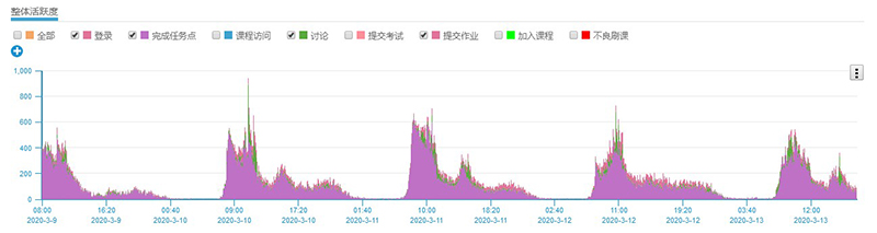 從學院在線教學平臺管理數據看,在線教學第三周內教學資源學生訪問量達到了983990人次,學生到課134631人次,完成課后作業(yè)649次,上交學生44266人次。各門課程學習任務完成率普遍有所提高,大多數課程按照教學計劃進度學生學習完成率已全部達到100%。
