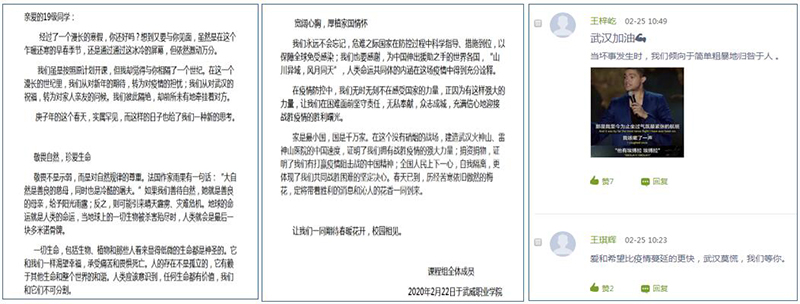 《中華優(yōu)秀傳統(tǒng)文化》課程團隊的馮文娟老師在開學(xué)第一天借助在線教學(xué)平臺向?qū)W生推送了《致2019級學(xué)生的一封信》,激勵學(xué)生要敬畏自然、珍愛生命,致敬英雄、感恩榜樣,寬闊心胸、厚植家國情懷。信中這樣寫道:“在疫情防控中,我們無時無刻不在感受國家的力量,正因為有這樣強大的力量,讓我們在困難面前堅守責(zé)任,無私奉獻,眾志成城,充滿信心地迎接戰(zhàn)勝疫情的勝利曙光?!薄?家是最小國,國是千萬家。在這個沒有硝煙的戰(zhàn)場,建造武漢火神山、雷神山醫(yī)院的中國速度,證明了我們擁有戰(zhàn)勝疫情的強大力量;捐資捐物,證明了我們有打贏疫情阻擊戰(zhàn)的中國精神;全國人民上下一心,自我隔離,更體現(xiàn)了我們共同戰(zhàn)勝困難的堅定決心。春天已到,歷經(jīng)苦寒依舊傲然的梅花,定將帶著勝利的消息和沁人的花香一同到來。”同時,為學(xué)生推送由央視頻和有道精品課共同錄制的《面對疫情教你如何有效防范》疫情防控專題視頻,與學(xué)生一起為打贏新冠肺炎疫情防控阻擊戰(zhàn)貢獻力量。