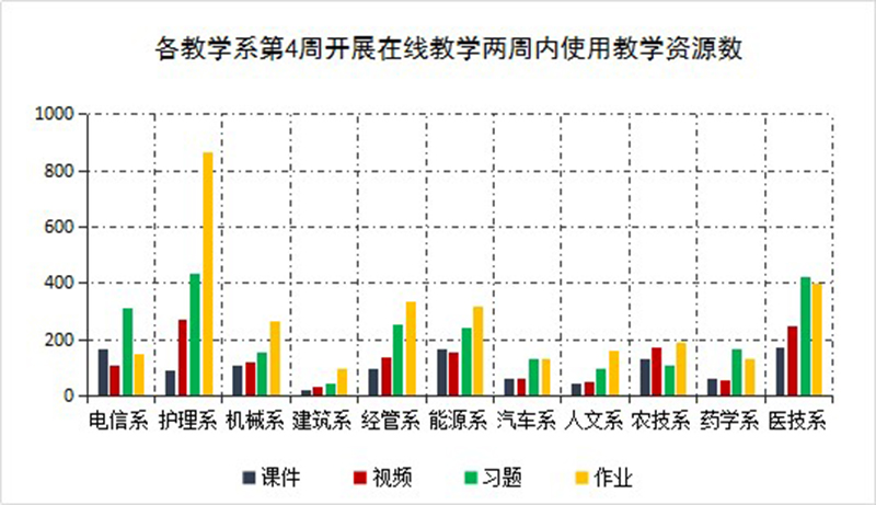 各教學(xué)系全面落實(shí)以學(xué)生為中心的教學(xué)理念,充分發(fā)揮班主任、任課教師、學(xué)生干部的監(jiān)督作用,提高在線教學(xué)成效。從各教學(xué)系整體統(tǒng)計(jì)數(shù)據(jù)看,第4周,教學(xué)資源學(xué)生訪問(wèn)量達(dá)到了926633人次,學(xué)生到課127211人次,完成課后作業(yè)638次,上交學(xué)生40512人次。各門(mén)課程學(xué)習(xí)任務(wù)完成率普遍有所提高,大多數(shù)課程按照教學(xué)計(jì)劃進(jìn)度學(xué)生學(xué)習(xí)完成率已全部達(dá)到100%。