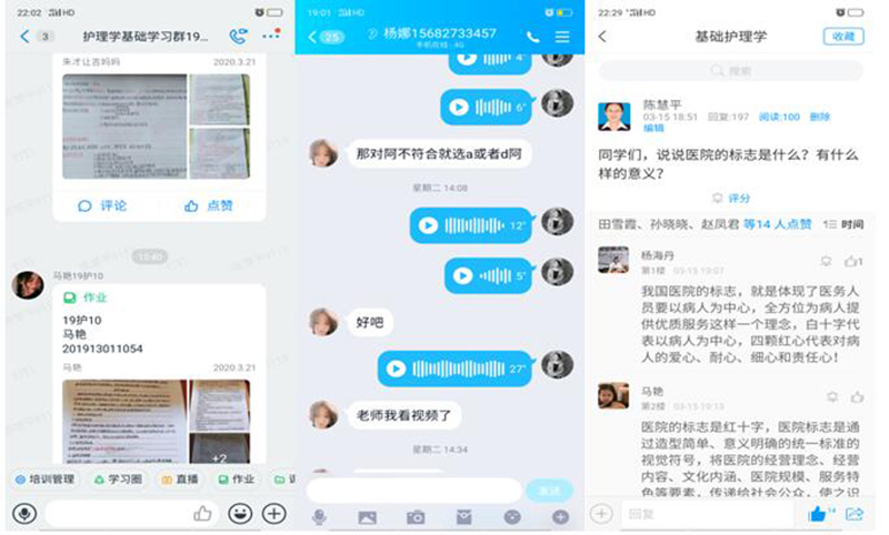 護(hù)理系通過(guò)“多平臺(tái)、多渠道”全面開(kāi)展在線教學(xué),主要采取“網(wǎng)絡(luò)課程+資料推送+討論答疑+互動(dòng)直播”的線上教學(xué)模式。全系24名教師全部實(shí)施線上教學(xué),課程共計(jì)11門(mén)次,已完成授課544學(xué)時(shí)(截至3月22日)。本周教師上傳課程課件93件,上傳視頻269個(gè),根據(jù)教學(xué)任務(wù)布置課堂練習(xí)題數(shù)量為435,布置課后作業(yè)題目數(shù)量為857,本周內(nèi)教師組織開(kāi)展討論、答疑的總次數(shù)為89次,學(xué)生參與答疑討論的次數(shù)為16874次。學(xué)生平均到課率95%以上。從學(xué)院教學(xué)平臺(tái)反饋數(shù)據(jù)看,本周課程訪問(wèn)量達(dá)到399415,位居全院第一。