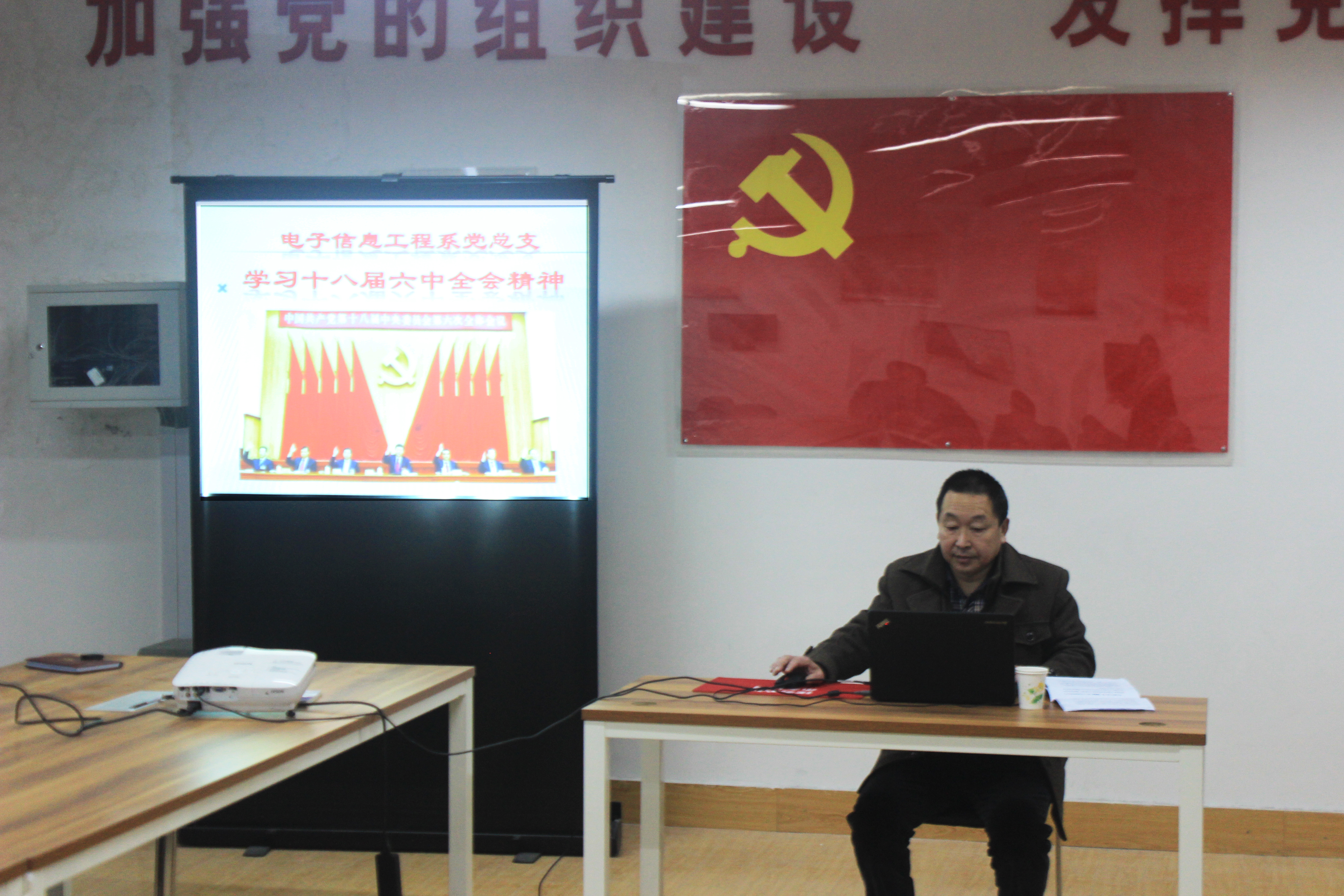 為認真學習領(lǐng)會黨的十八屆六中全會重要精神,全面加強我系黨的建設(shè),更好地推動我系各項工作開展,按照學院《關(guān)于開展十八屆六中全會精神宣講的通知》要求,電子信息工程系于1月4日邀請人文藝術(shù)教育系劉心副教授進行了十八屆六中全會精神宣講。會議由系黨總支書記袁青年同志主持,全體教師及學生入黨積極分子參加了宣講會。