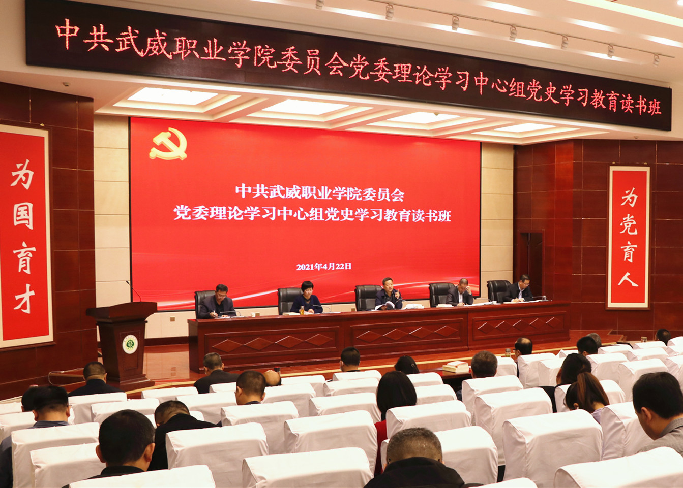 正值第26個“世界讀書日”到來之際,4月22上午,學院黨委理論學習中心組黨史學習教育讀書班暨學習(擴大)會議在大學生活動中心菁英廳舉行。學院領(lǐng)導班子成員、全體中層干部、各基層黨組織書記、專職組織員和支委委員共100人參加讀書班學習。黨委書記、院長趙明主持開班式并講話。