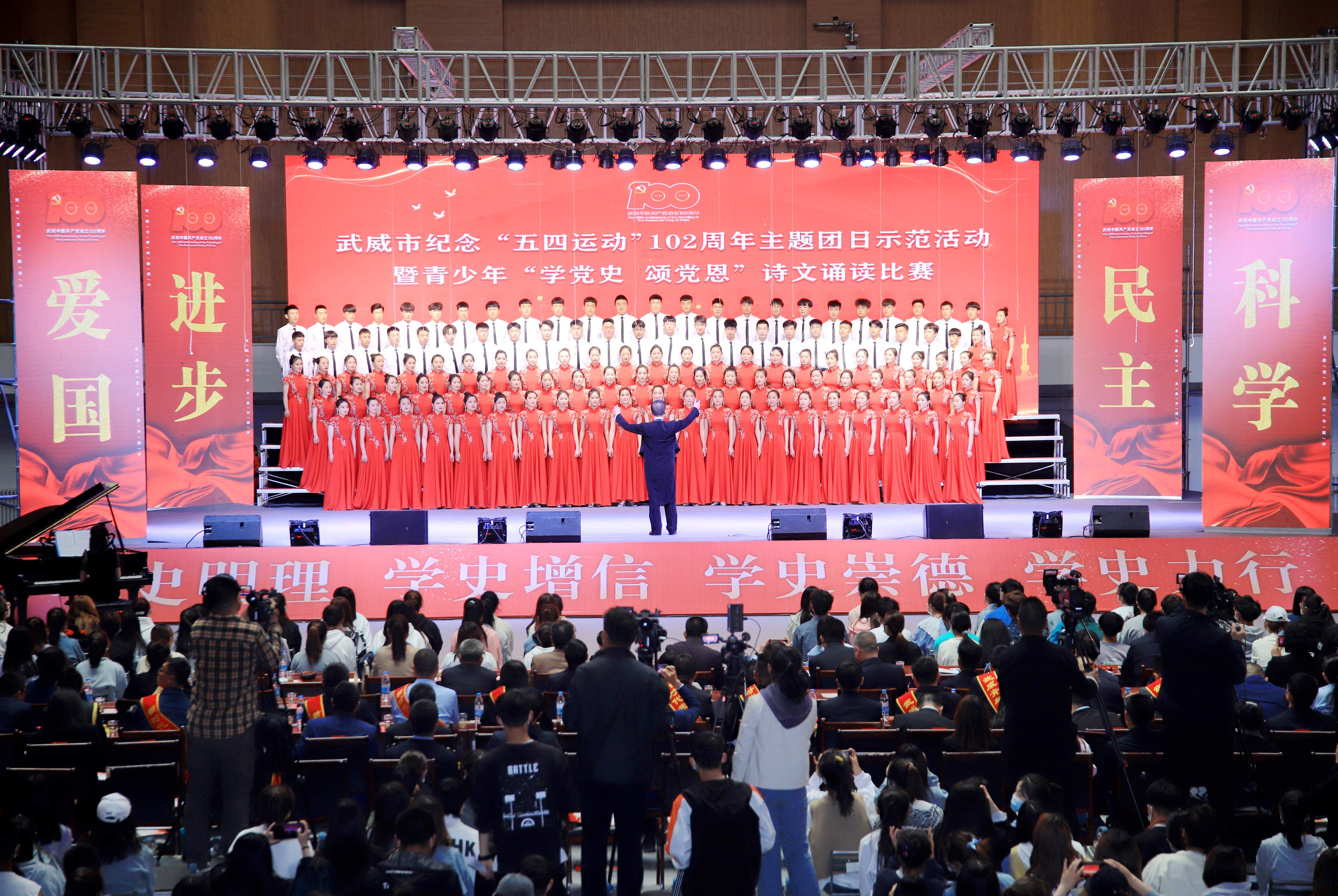 今年是中國(guó)共產(chǎn)黨成立100周年,也是五四運(yùn)動(dòng)102周年。為傳承革命精神,大力弘揚(yáng)愛國(guó)、進(jìn)步、民主、科學(xué)的偉大五四精神,以實(shí)際行動(dòng)迎接黨的百年華誕,深化黨史學(xué)習(xí)教育,牢記青年初心使命,堅(jiān)定不移感黨恩、強(qiáng)信念、跟黨走,4月29日下午,武威市青少年“學(xué)黨史、頌黨恩”詩(shī)文誦讀比賽在我院體育館舉行。