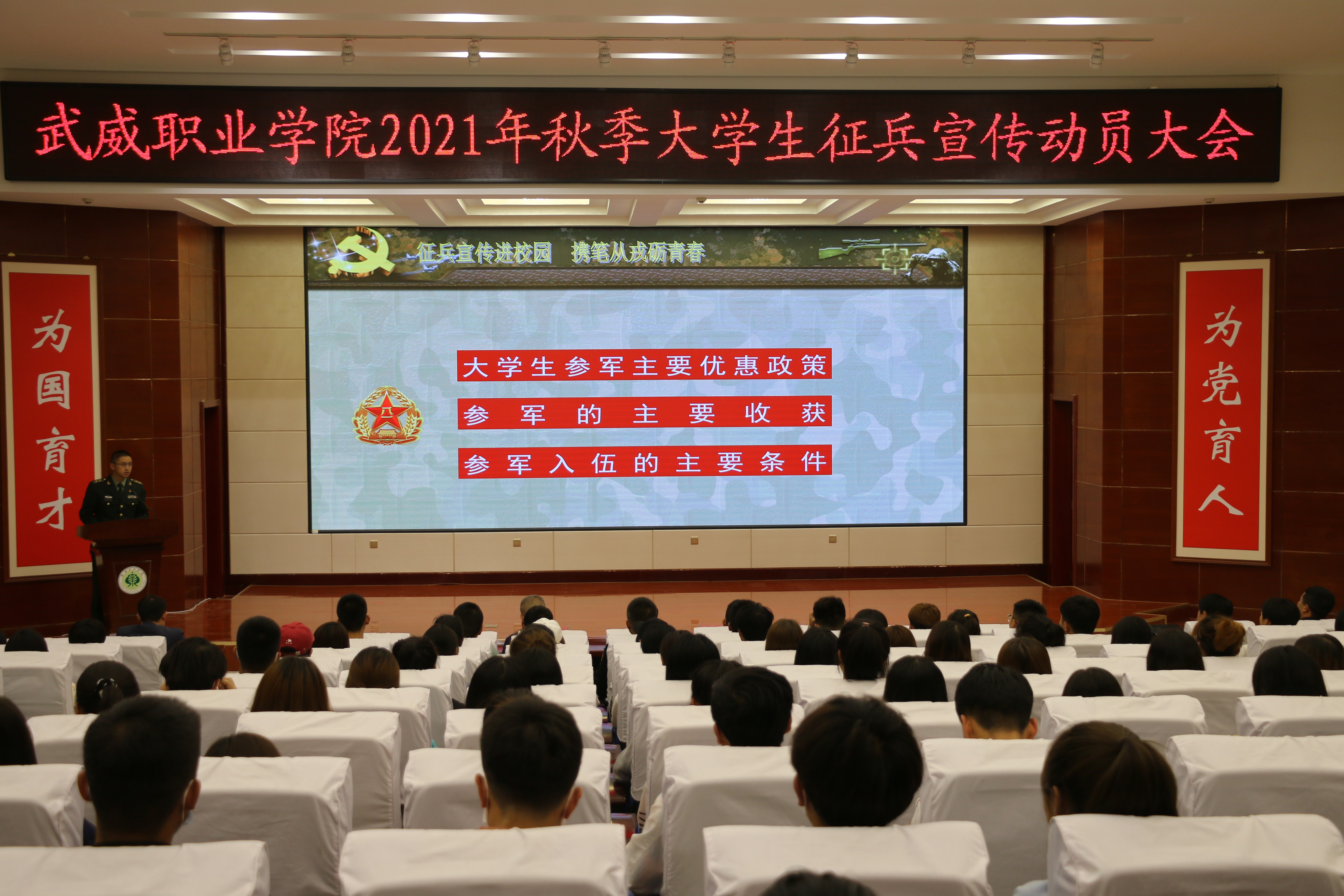 征兵宣傳動(dòng)員大會(huì)上,同學(xué)們觀看了甘肅省和武威市征兵宣傳片,何志強(qiáng)圍繞征兵優(yōu)撫政策和應(yīng)征報(bào)名條件、程序進(jìn)行了宣講,全方位、多角度向同學(xué)們?cè)敿?xì)介紹了2021年大學(xué)生征兵的入伍流程、應(yīng)征條件、選用培養(yǎng)、優(yōu)惠政策等。