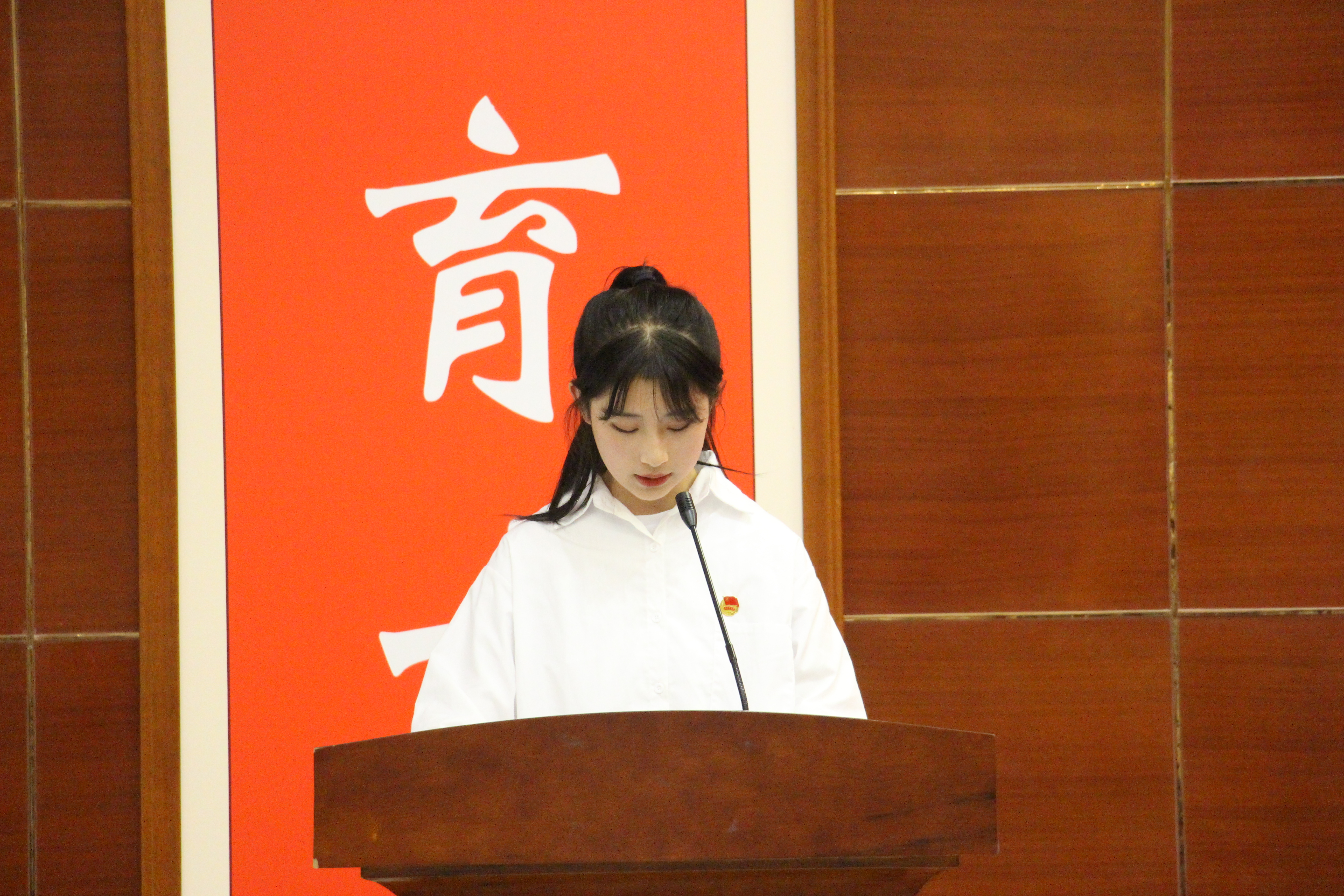 院團(tuán)委老師劉吉仁宣讀了75名新團(tuán)員名單,團(tuán)員代表馬婧向新團(tuán)員闡釋了團(tuán)徽的組成及象征的意義,老團(tuán)員代表為新團(tuán)員代表佩戴團(tuán)徽。隨后,全體新老團(tuán)員面對著鮮艷的團(tuán)旗,緊握右拳莊嚴(yán)宣誓。