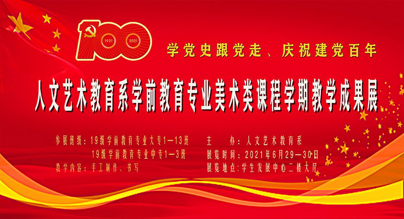 6月29日—30日人文藝術(shù)教育系在大學(xué)生發(fā)展中心二樓菁英廳大廳舉辦“學(xué)黨史跟黨走”、“慶祝建黨百年”為主題的學(xué)前教育專(zhuān)業(yè)美術(shù)類(lèi)課程學(xué)期教學(xué)成果展。
