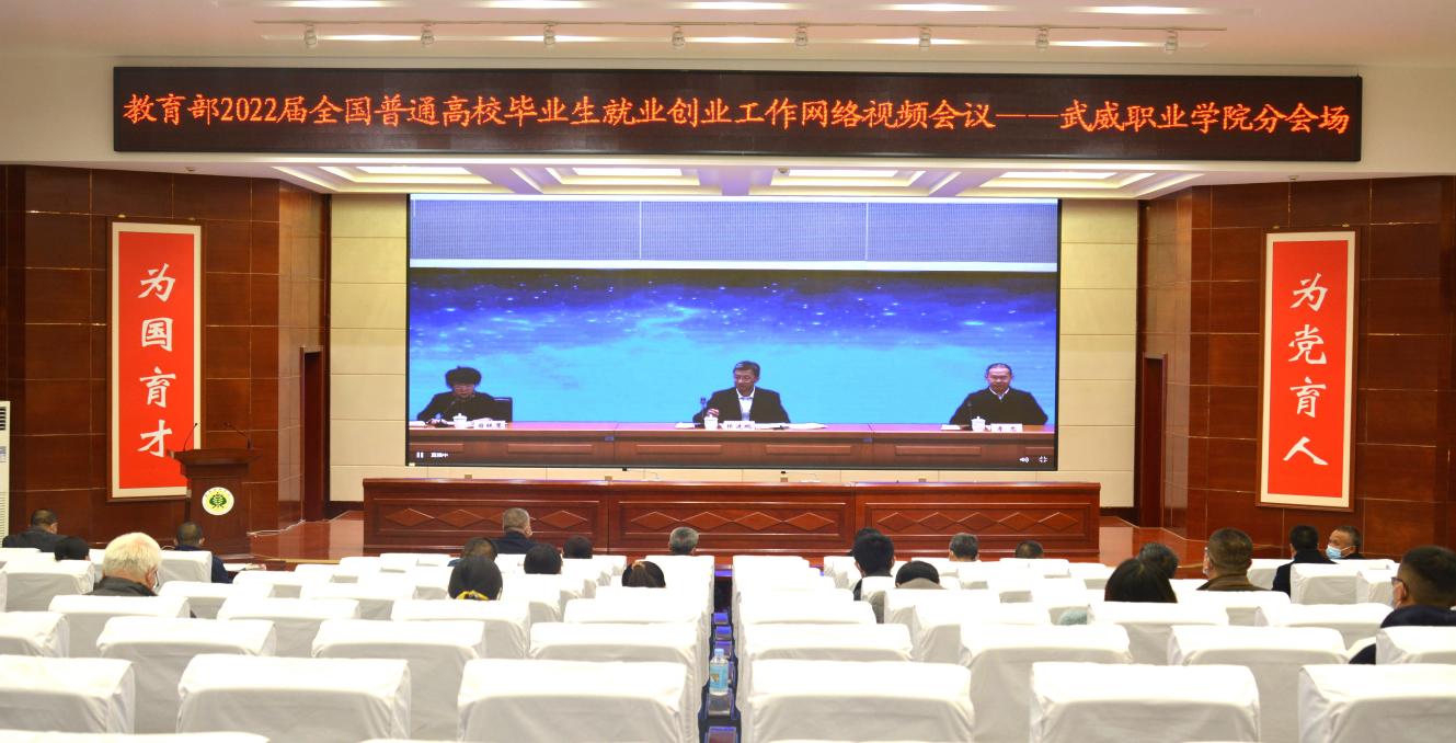 11月19日下午,教育部、人力資源社會保障部召開2022屆普通高校畢業(yè)生就業(yè)視頻會議。教育部黨組書記、部長懷進鵬,人力資源社會保障部黨組成員、副部長李忠出席會議并講話,教育部黨組成員、副部長翁鐵慧主持會議。我院設(shè)立武威職業(yè)學院分會場,學院黨委書記、院長趙明,副院長王守云,招就處、雙創(chuàng)中心、學工處相關(guān)負責同志,各教學院系黨總支書記、主任、就業(yè)工作輔導員及畢業(yè)班班主任共計86人,在學院學生發(fā)展中心菁英廳集中參加網(wǎng)絡(luò)視頻會議。